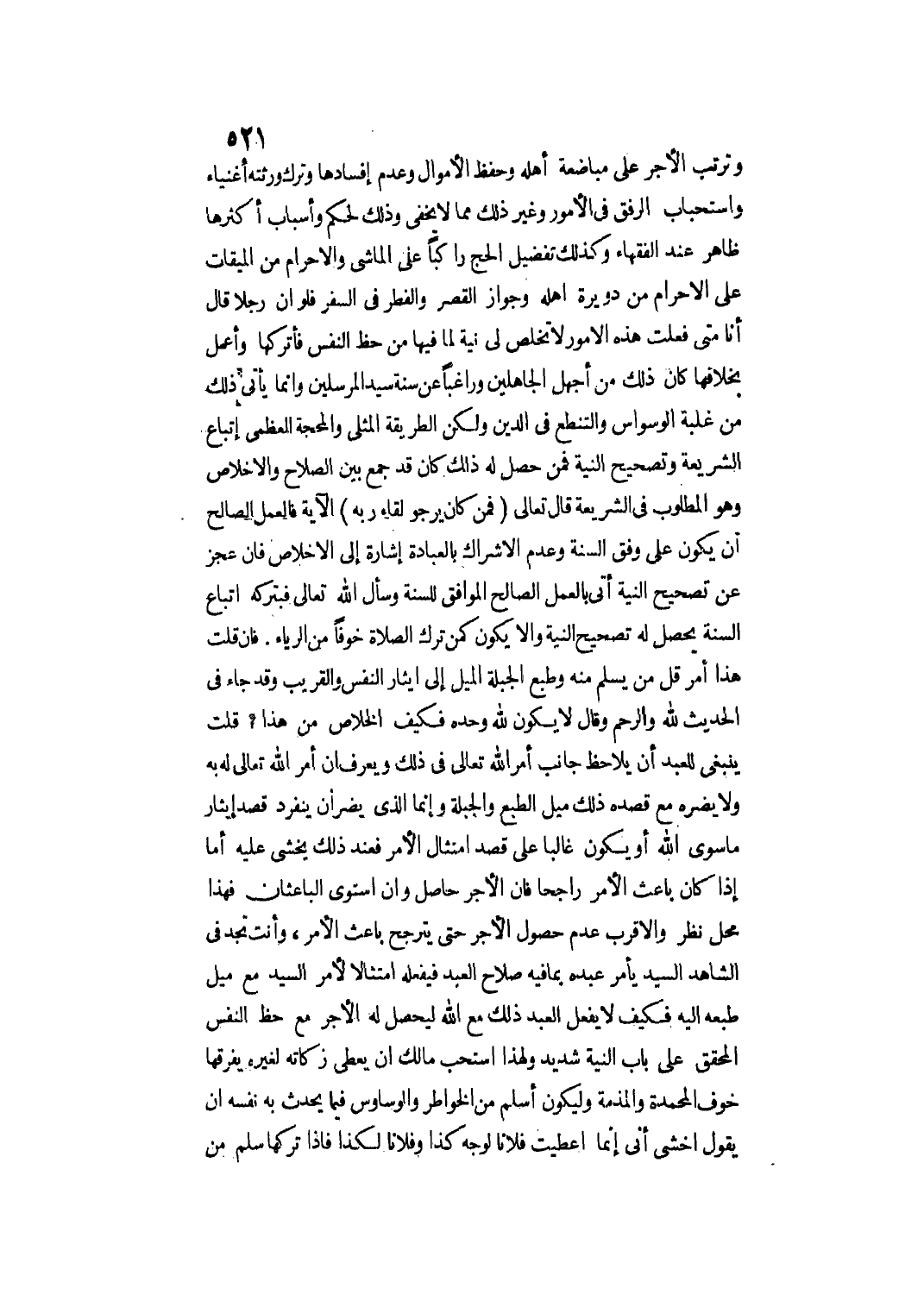 وَكَذَلِكَ تَفْضِيلُ الْحَجِّ رَاكِبًا عَلَى الْمَاشِي وَالْإِحْرَامِ مِنْ الْمِيقَاتِ عَلَى الْإِحْرَامِ مِنْ دُوَيْرَةِ أَهْلِهِ وَجَوَازِ الْقَصْرِ وَالْفِطْرِ فِي السَّفَرِ، فَلَوْ أَنَّ رَجُلًا قَالَ: أَنَا مَتَى فَعَلْتُ هَذِهِ الْأُمُورَ لَا تَخْلُصُ لِي نِيَّةٌ لِمَا فِيهَا مِنْ حَظِّ النَّفْسِ فَأَتْرُكُهَا وَأَعْمَلُ بِخِلَافِهَا كَانَ ذَلِكَ مِنْ أَجْهَلِ الْجَاهِلِينَ وَرَاغِبًا عَنْ سُنَّةِ سَيِّدِ الْمُرْسَلِينَ وَإِنَّمَا يَأْتِي ذَلِكَ مِنْ غَلَبَةِ الْوَسْوَاسِ وَالتَّنَطُّعِ فِي الدِّينِ وَلَكِنَّ الطَّرِيقَةَ الْمُثْلَى وَالْمَحَجَّةَ الْعُظْمَى إتْبَاعُ الشَّرِيعَةِ وَتَصْحِيحُ النِّيَّةِ فَمَنْ حَصَلَ لَهُ ذَلِكَ كَانَ قَدْ جَمَعَ بَيْنَ الصَّلَاحِ وَالْإِخْلَاصِ وَهُوَ الْمَطْلُوبُ فِي الشَّرِيعَةِ.
