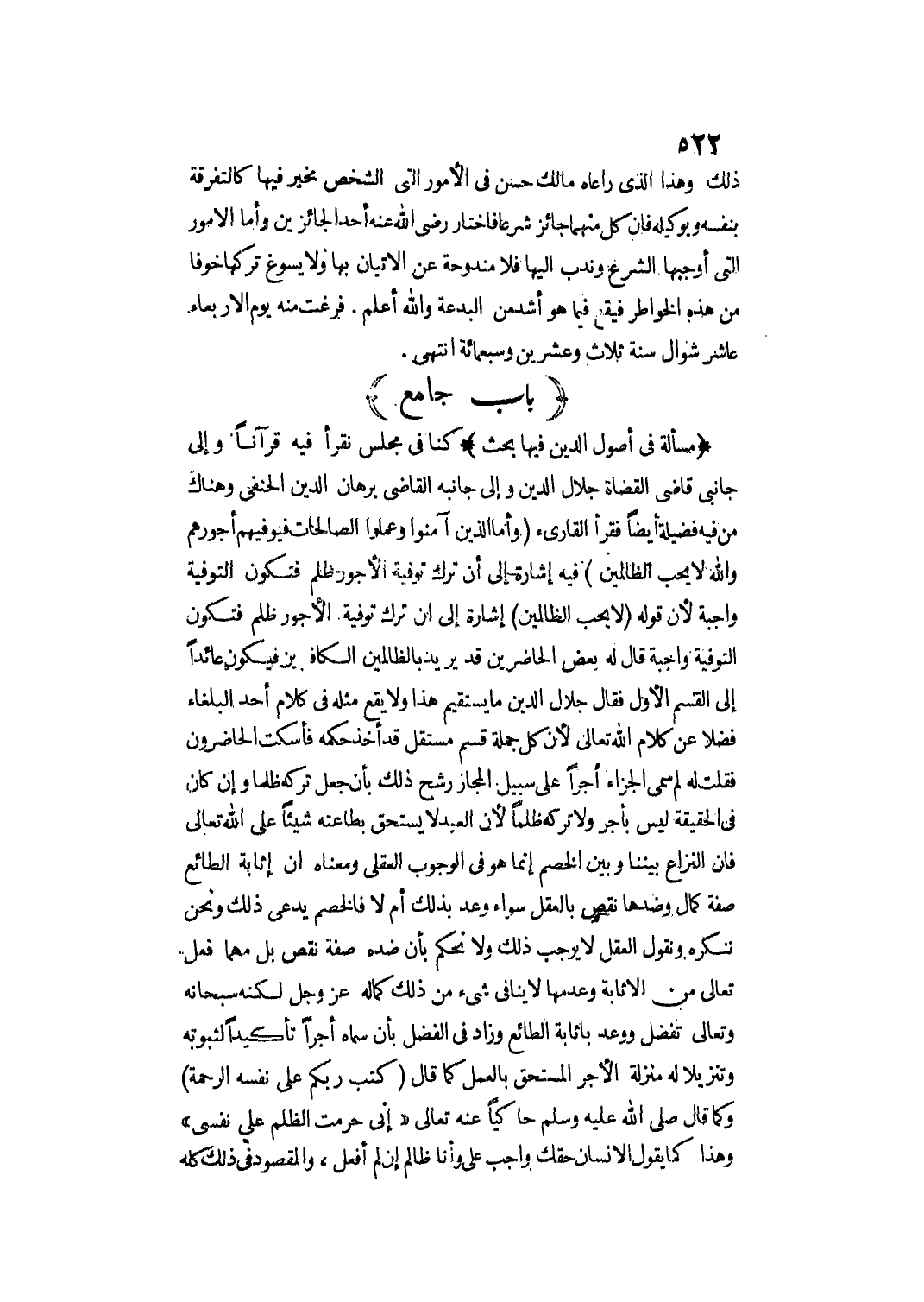 (بَابٌ جَامِعٌ) (مَسْأَلَةٌ فِي أُصُولِ الدِّينِ فِيهَا بَحْثٌ) كُنَّا فِي مَجْلِسٍ نَقْرَأُ فِيهِ قُرْآنًا وَإِلَى جَانِبِي قَاضِي الْقُضَاةِ جَلَالُ الدِّينِ وَإِلَى جَانِبِهِ الْقَاضِي بُرْهَانُ الدِّينِ الْحَنَفِيُّ وَهُنَاكَ مَنْ فِيهِ فَضِيلَةٌ أَيْضًا فَقَرَأَ الْقَارِئُ {وَأَمَّا الَّذِينَ آمَنُوا وَعَمِلُوا الصَّالِحَاتِ فَيُوَفِّيهِمْ أُجُورَهُمْ وَاللَّهُ لا يُحِبُّ الظَّالِمِينَ} [آل عمران: 57] فِيهِ إشَارَةٌ إلَى أَنَّ تَرْكَ تَوْفِيَةِ الْأُجُورِ ظُلْمٌ فَتَكُونُ التَّوْفِيَةُ وَاجِبَةً؛ لِأَنَّ قَوْلَهُ {لا يُحِبُّ الظَّالِمِينَ} [آل عمران: 57] إشَارَةٌ إلَى أَنَّ تَرْكَ تَوْفِيَةِ الْأُجُورِ ظُلْمٌ فَتَكُونُ التَّوْفِيَةُ وَاجِبَةً قَالَ لَهُ بَعْضُ الْحَاضِرِينَ قَدْ يُرِيدُ بِالظَّالِمِينَ الْكَافِرِينَ فَيَكُونُ عَائِدًا إلَى الْقِسْمِ الْأَوَّلِ، فَقَالَ جَلَالُ الدِّينِ: مَا يَسْتَقِيمُ هَذَا وَلَا يَقَعُ مِثْلُهُ فِي كَلَامِ أَحَدِ الْبُلَغَاءِ فَضْلًا عَنْ كَلَامِ اللَّهِ تَعَالَى؛ لِأَنَّ كُلَّ جُمْلَةٍ قِسْمٌ مُسْتَقِلٌّ قَدْ أَخَذَ حُكْمَهُ فَأَسْكَتَ الْحَاضِرُونَ فَقُلْت لَهُ: لِمَ سَمَّى الْجَزَاءَ أَجْرًا عَلَى سَبِيلِ الْمَجَازِ رَشَّحَ ذَلِكَ بِأَنْ جَعَلَ تَرْكِهِ ظُلْمًا وَإِنْ كَانَ فِي الْحَقِيقَةِ لَيْسَ بِأَجْرٍ وَلَا تَرْكِهِ ظُلْمًا؛ لِأَنَّ الْعَبْدَ لَا يَسْتَحِقُّ بِطَاعَتِهِ شَيْئًا عَلَى اللَّهِ تَعَالَى فَإِنَّ النِّزَاعَ بَيْنَنَا وَبَيْنَ الْخَصْمِ إنَّمَا هُوَ فِي الْوُجُوبِ الْعَقْلِيِّ، وَمَعْنَاهُ أَنَّ إثَابَةَ الطَّائِعِ صِفَةُ كَمَالٍ وَضِدُّهَا نَقْصٌ بِالْعَقْلِ سَوَاءٌ وَعَدَ بِذَلِكَ أَمْ لَا.