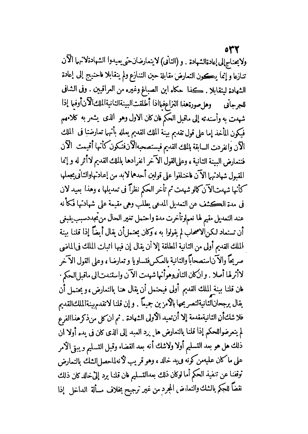 وَفِي الشَّافِي لِلْجُرْجَانِيِّ وَهَلْ صُورَةُ هَذَا النِّزَاعِ فِيمَا إذَا أَطْلَقَتْ الْبَيِّنَةُ الثَّانِيَةُ الْمِلْكَ الْآنَ أَوْ فِيمَا إذَا شَهِدَتْ بِهِ وَأَسْنَدَتْهُ إلَى مَا قَبْلَ الْحُكْمِ فَإِنْ كَانَ الْأَوَّلُ وَهُوَ الَّذِي يُشْعِرُ بِهِ كَلَامُهُمْ فَيَكُونُ الْمَأْخَذُ إمَّا عَلَى قَوْلِ تَقْدِيمِ بَيِّنَةِ الْمِلْكِ الْقَدِيمِ يُعَلِّلُهُ بِأَنَّهُمَا تَعَارَضَتَا فِي الْمِلْكِ الْآنَ وَانْفَرَدَتْ السَّابِقَةُ بِالْمِلْكِ الْقَدِيمِ فَيَسْتَصْحِبُهُ الْآنَ فَتَكُونُ كَأَنَّهَا أُقِيمَتْ الْآنَ فَتَتَعَارَضُ الْبَيِّنَةُ الثَّانِيَةُ، وَعَلَى الْقَوْلِ الْآخَرِ انْفِرَادُهَا بِالْمِلْكِ الْقَدِيمِ لَا أَثَرَ لَهُ وَإِنَّمَا الْمَقْبُولُ شَهَادَتُهُمَا الْآنَ فَاخْتَلَفُوا عَلَى قَوْلَيْنِ: أَحَدِهِمَا: لَا بُدَّ مِنْ إعَادَتِهَا. وَالثَّانِي: يَجْعَلُهَا كَأَنَّهَا شَهِدَتْ الْآنَ كَمَا لَوْ شَهِدَتْ ثُمَّ تَأَخَّرَ الْحُكْمُ نَظَرًا فِي تَعْدِيلِهَا، وَهَذَا بَعِيدٌ؛ لِأَنَّ فِي مُدَّةِ الْكَشْفِ عَنْ التَّعْدِيلِ الْمُدَّعِي يَطْلُبُ وَهِيَ مُقِيمَةٌ عَلَى شَهَادَتِهَا فَكَأَنَّهُ عِنْدَ التَّعْدِيلِ مُقِيمٌ لَهَا نَعَمْ لَوْ تَأَخَّرَتْ مُدَّةً وَاحْتُمِلَ تَغَيُّرُ الْحَالِ مِنْ تَجَدُّدِ سَبَبٍ يَنْبَغِي أَنْ تُسْتَعَادَ لَكِنَّ الْأَصْحَابَ لَمْ يَقُولُوا بِهِ، وَكَانَ يَحْتَمِلُ أَنْ يُقَالَ أَيْضًا: إذَا قُلْنَا: بَيِّنَةُ الْمِلْكِ الْقَدِيمِ أَوْلَى مِنْ الثَّانِيَةِ الْمُطْلِقَةِ، إلَّا أَنْ يُقَالَ: إنَّ فِيهَا إثْبَاتَ الْمِلْكِ فِي الْمَاضِي صَرِيحًا وَالْآنَ اسْتِصْحَابًا وَالثَّانِيَةُ بِالْعَكْسِ فَتَسَاوَيَا وَتَعَارَضَا، وَعَلَى الْقَوْلِ الْآخَرِ لَا أَثَرَ لَهَا أَصْلًا.