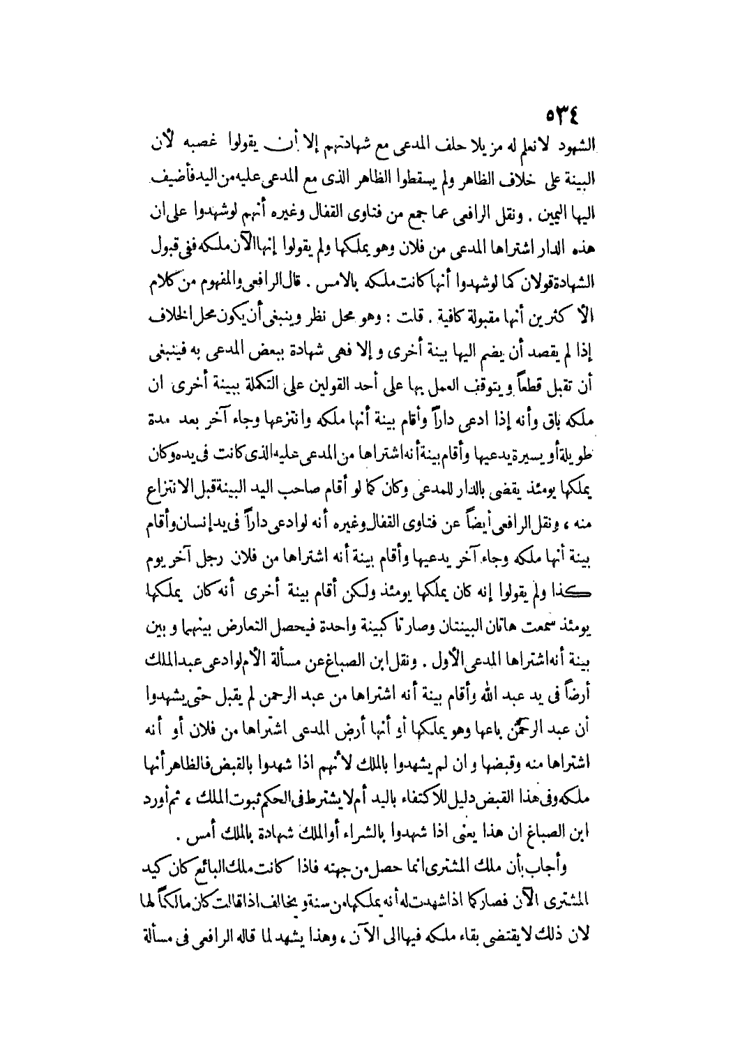 وَنَقَلَ الرَّافِعِيُّ أَيْضًا عَنْ فَتَاوَى الْقَفَّالِ وَغَيْرِهِ أَنَّهُ لَوْ ادَّعَى دَارًا فِي يَدِ إنْسَانٍ وَأَقَامَ بَيِّنَةً أَنَّهَا مِلْكُهُ وَجَاءَ آخَرُ يَدَّعِيهَا وَأَقَامَ بَيِّنَةً أَنَّهُ اشْتَرَاهَا مِنْ فُلَانٍ رَجُلٍ آخَرَ يَوْمَ كَذَا وَلَمْ يَقُولُوا: إنَّهُ كَانَ يَمْلِكُهَا يَوْمَئِذٍ وَلَكِنْ أَقَامَ بَيِّنَةً أُخْرَى أَنَّهُ كَانَ يَمْلِكُهَا يَوْمَئِذٍ سُمِعَتْ هَاتَانِ الْبَيِّنَتَانِ وَصَارَتَا كَبَيِّنَةٍ وَاحِدَةٍ فَيَحْصُلُ التَّعَارُضُ بَيْنَهُمَا وَبَيْنَ بَيِّنَةِ أَنَّهُ اشْتَرَاهَا الْمُدَّعِي الْأَوَّلُ.