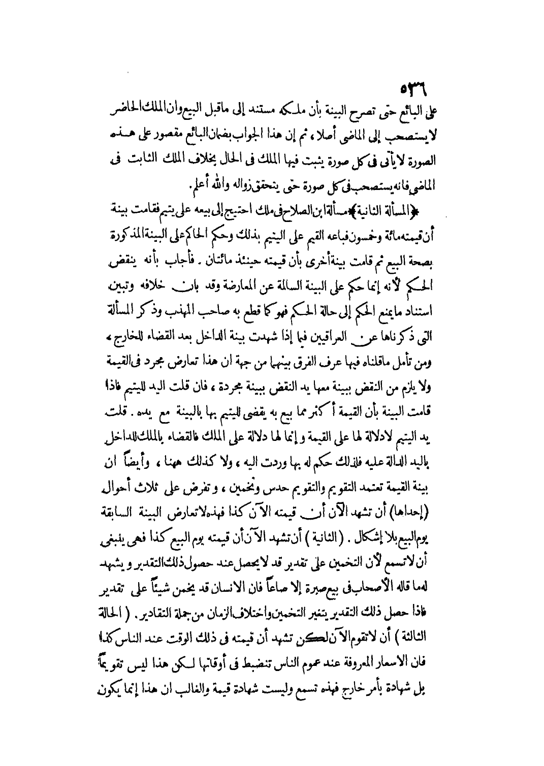 عَلَى الْبَائِعِ حَتَّى تُصَرِّحَ الْبَيِّنَةُ بِأَنَّ مِلْكَهُ مُسْتَنِدٌ إلَى مَا قَبْلَ الْبَيْعِ وَأَنَّ الْمِلْكَ الْحَاضِرَ لَا يُسْتَصْحَبُ إلَى الْمَاضِي أَصْلًا، ثُمَّ إنَّ هَذَا الْجَوَابَ بِضَمَانِ الْبَائِعِ مَقْصُورٌ عَلَى هَذِهِ الصُّورَةِ لَا يَأْتِي فِي كُلِّ صُورَةٍ يَثْبُتُ فِيهَا الْمِلْكُ فِي الْحَالِ بِخِلَافِ الْمِلْكِ الثَّابِتِ فِي الْمَاضِي فَإِنَّهُ يُسْتَصْحَبُ فِي كُلِّ صُورَةٍ حَتَّى يَتَحَقَّقَ زَوَالُهُ. وَاَللَّهُ أَعْلَمُ.