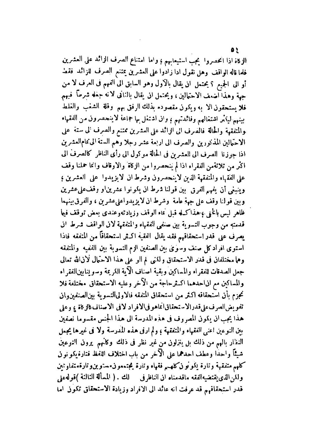يَحْتَمِلُ أَنْ يُقَالَ بِالْأَوَّلِ وَهُوَ السَّابِقُ إلَى الْفَهْمِ فِي الْعُرْفِ لَا مِنْ جِهَةٍ وَهَذَا أَضْعَفُ الِاحْتِمَالَيْنِ، وَيَحْتَمِلُ أَنْ يُقَالَ بِالثَّانِي؛ لِأَنَّهُ جَعَلَهُ شَرْطًا فِيهِمْ فَلَا يَسْتَحِقُّونَ إلَّا بِهِ وَيَكُونُ مَقْصُودُهُ بِذَلِكَ الرِّفْقَ بِهِمْ وَقِلَّةَ الشَّغَبِ وَالْغَلَطِ بَيْنَهُمْ لِيُكْثِرَ اشْتِغَالَهُمْ وَفَائِدَتَهُمْ؛ وَإِنْ اشْتَغَلَ بِهَا جَمَاعَةٌ لَا يَنْحَصِرُونَ مِنْ الْفُقَهَاءِ وَالْمُتَفَقِّهَةِ وَالْحَالَّةِ فَالصَّرْفُ إلَى الزَّائِدِ عَلَى الْعِشْرِينَ مُمْتَنِعٌ وَالصَّرْفُ إلَى سِتَّةٍ عَلَى الِاحْتِمَالَيْنِ الْمَذْكُورَيْنِ وَالصَّرْفُ إلَى أَرْبَعَةَ عَشَرَ رَجُلًا وَهُمْ السِّتَّةُ إلَى تَمَامِ الْعِشْرِينَ إذَا جَوَّزْنَا الصَّرْفَ إلَى الْعِشْرِينَ فِي الْحَالَّةِ مَوْكُولٌ إلَى رَأْيِ النَّاظِرِ كَالصَّرْفِ إلَى أَكْثَرَ مِنْ ثَلَاثَةٍ مِنْ الْفُقَرَاء إذَا لَمْ يَنْحَصِرُوا مِنْ الزَّكَاةِ وَالْأَوْقَافِ وَإِنَّمَا حَمَلَنَا وَقَفَ عَلَى الْفُقَهَاءِ وَالْمُتَفَقِّهَةِ الَّذِينَ لَا يَنْحَصِرُونَ وَشَرَطَ أَنْ لَا يَزِيدُوا عَلَى الْعِشْرِينَ؛ وَيَنْبَغِي أَنْ يُفْهَمَ الْفَرْقُ بَيْنَ قَوْلِنَا شَرَطَ أَنْ يَكُونُوا عِشْرِينَ أَوْ وَقَفَ عَلَى عِشْرِينَ وَبَيْنَ قَوْلِنَا وَقَفَ عَلَى جِهَةٍ عَامَّةٍ وَشَرَطَ أَنْ لَا يَزِيدُوا عَلَى عِشْرِينَ، وَالْفَرْقُ بَيْنَهُمَا ظَاهِرٌ لَيْسَ بِالْخَفِيِّ؛ هَذَا كُلُّهُ قَبْلَ نَمَاءِ الْوَقْفِ وَزِيَادَتِهِ وَعِنْدِي بَعْضُ تَوَقُّفٍ فِيمَا قَدَّمْته مِنْ وُجُوبِ التَّسْوِيَةِ بَيْنَ صِنْفَيْ الْفُقَهَاءِ وَالْمُتَفَقِّهَةِ؛ لِأَنَّ الْوَاقِفَ شَرَطَ أَنْ يُصْرَفَ عَلَى قَدْرِ اسْتِحْقَاقِهِمْ فَقَدْ يُقَالُ الْفَقِيهُ أَكْثَرُ اسْتِحْقَاقًا مِنْ الْمُتَفَقِّهِ.