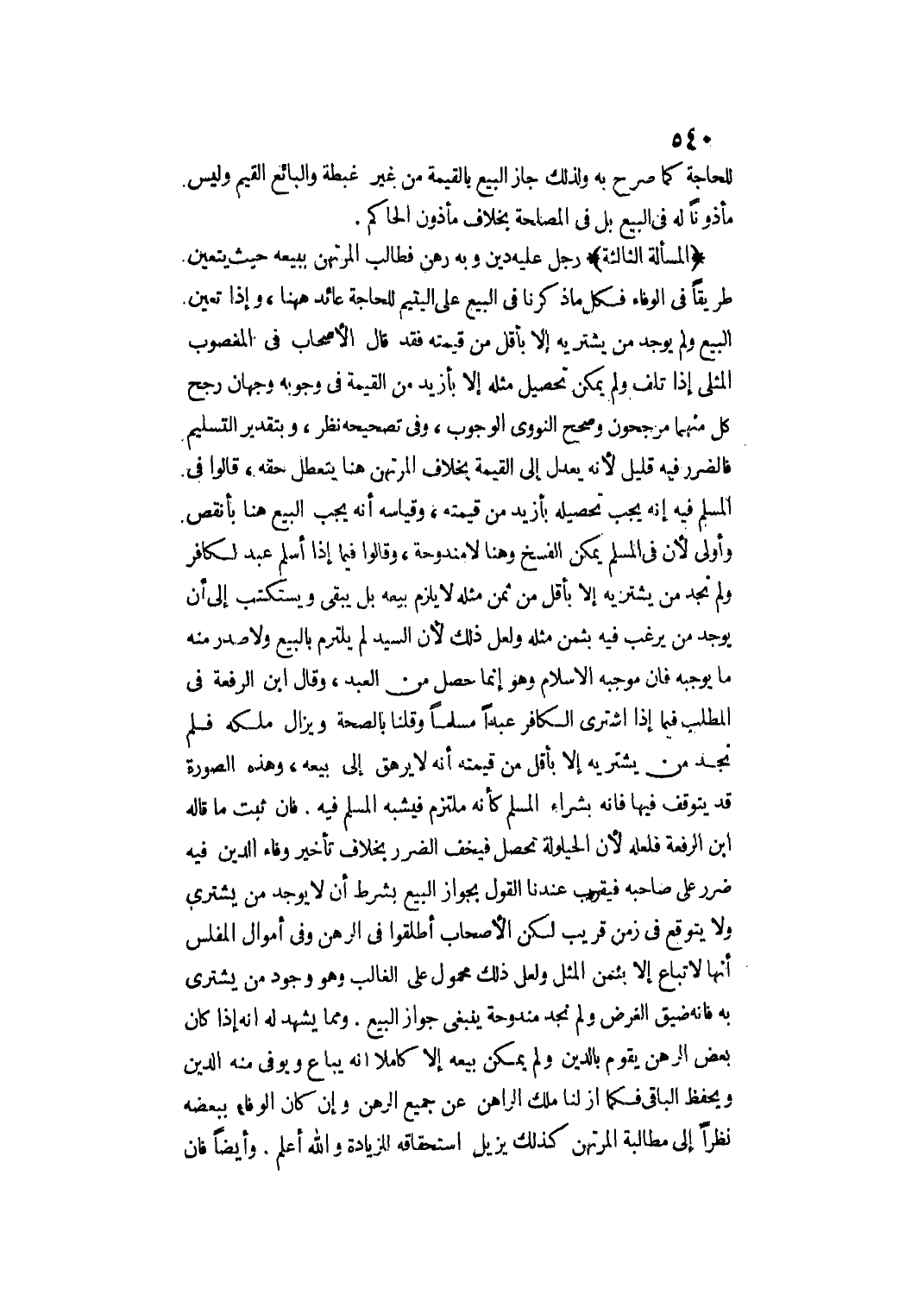 (الْمَسْأَلَةُ الثَّالِثَةُ) رَجُلٌ عَلَيْهِ دَيْنٌ وَبِهِ رَهْنٌ فَطَالَبَ الْمُرْتَهِنُ بِبَيْعِهِ حَيْثُ يَتَعَيَّنُ طَرِيقًا فِي الْوَفَاءِ فَكُلُّ مَا ذَكَرْنَا فِي الْبَيْعِ عَلَى الْيَتِيمِ لِلْحَاجَةِ عَائِدٌ هَاهُنَا، وَإِذَا تَعَيَّنَ الْبَيْعُ وَلَمْ يُوجَدْ مَنْ يَشْتَرِيهِ إلَّا بِأَقَلَّ مِنْ قِيمَتِهِ فَقَدْ قَالَ الْأَصْحَابُ فِي الْمَغْصُوبِ الْمِثْلِيِّ إذَا تَلِفَ وَلَمْ يُمْكِنْ تَحْصِيلُ مِثْلِهِ إلَّا بِأَزْيَدَ مِنْ الْقِيمَةِ فِي وُجُوبِهِ وَجْهَانِ رَجَّحَ كُلًّا مِنْهُمَا مُرَجِّحُونَ وَصَحَّحَ النَّوَوِيُّ الْوُجُوبَ، وَفِي تَصْحِيحِهِ نَظَرٌ، وَبِتَقْدِيرِ التَّسْلِيمِ فَالضَّرَرُ فِيهِ قَلِيلٌ؛ لِأَنَّهُ يَعْدِلُ إلَى الْقِيمَةِ بِخِلَافِ الْمُرْتَهِنِ هُنَا يَتَعَطَّلُ حَقُّهُ، قَالُوا فِي الْمُسْلَمِ فِيهِ: إنَّهُ يَجِبُ تَحْصِيلُهُ بِأَزْيَدَ مِنْ قِيمَتِهِ، وَقِيَاسُهُ أَنَّهُ يَجِبُ الْبَيْعُ هُنَا بِأَنْقَصَ وَأَوْلَى؛ لِأَنَّ فِي الْمُسْلَمِ يُمْكِنُ الْفَسْخُ وَهُنَا لَا مَنْدُوحَةَ، وَقَالُوا فِيمَا إذَا أَسْلَمَ عَبْدٌ لِكَافِرٍ وَلَمْ نَجِدْ مَنْ يَشْتَرِيهِ إلَّا بِأَقَلَّ مِنْ ثَمَنِ مِثْلِهِ لَا يَلْزَمُ بَيْعُهُ بَلْ يَبْقَى وَيُسْتَكْتَبُ إلَى أَنْ يُوجَدَ مَنْ يَرْغَبُ فِيهِ بِثَمَنِ مِثْلِهِ وَلَعَلَّ ذَلِكَ لِأَنَّ السَّيِّدَ لَمْ يَلْتَزِمْ بِالْبَيْعِ وَلَا صَدَرَ مِنْهُ مَا يُوجِبُهُ فَإِنَّ مُوجِبَهُ الْإِسْلَامُ وَهُوَ إنَّمَا حَصَلَ مِنْ الْعَبْدِ.