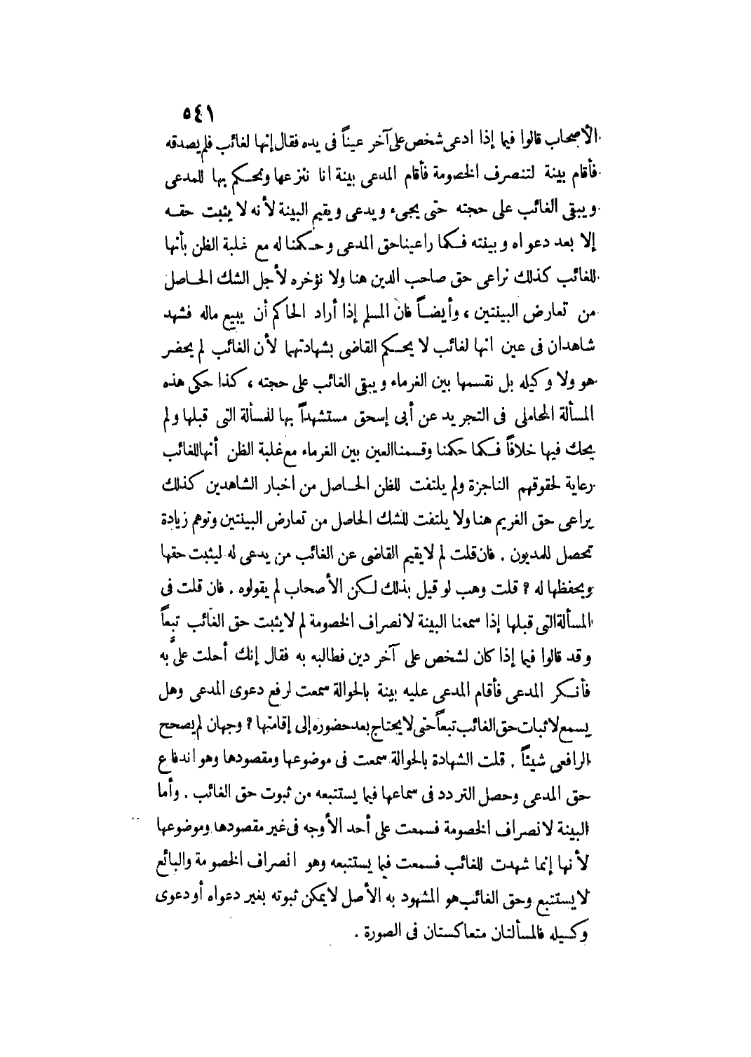 فَإِنْ قُلْت فِي الْمَسْأَلَةِ الَّتِي قَبْلَهَا: إذَا سَمِعْنَا الْبَيِّنَةَ لِانْصِرَافِ الْخُصُومَةِ لِمَ لَا يَثْبُتُ حَقُّ الْغَائِبِ تَبَعًا وَقَدْ قَالُوا فِيمَا إذَا كَانَ لِشَخْصٍ عَلَى آخَرَ دَيْنٌ فَطَالَبَهُ بِهِ فَقَالَ إنَّك أَحَلْت عَلَيَّ بِهِ فَأَنْكَرَ الْمُدَّعِي فَأَقَامَ الْمُدَّعَى عَلَيْهِ بَيِّنَةً بِالْحَوَالَةِ سُمِعَتْ لِرَفْعِ دَعْوَى الْمُدَّعِي وَهَلْ يُسْمَعُ لِإِثْبَاتِ حَقِّ الْغَائِبِ تَبَعًا حَتَّى لَا يَحْتَاجَ بَعْدَ حُضُورِهِ إلَى إقَامَتِهَا؟ وَجْهَانِ لَمْ يُصَحِّحْ الرَّافِعِيُّ شَيْئًا.