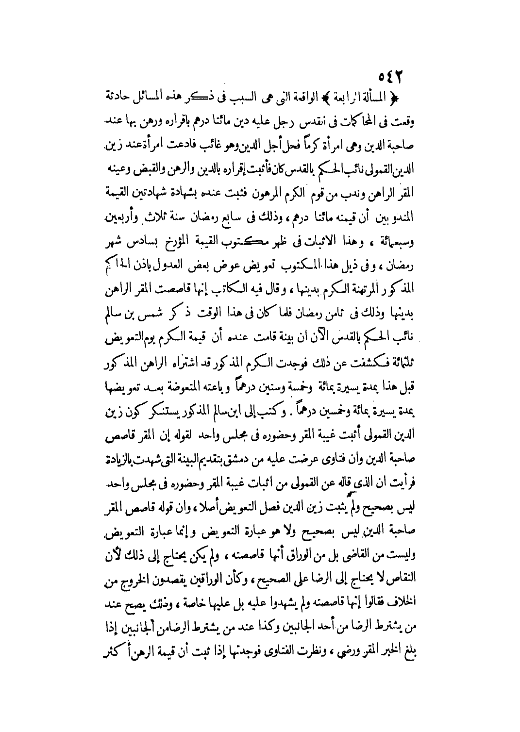 (الْمَسْأَلَةُ الرَّابِعَةُ) الْوَاقِعَةُ الَّتِي هِيَ السَّبَبُ فِي ذِكْرِ هَذِهِ الْمَسَائِلِ حَادِثَةٌ وَقَعَتْ فِي الْمُحَاكَمَاتِ فِي الْقُدْسِ رَجُلٌ عَلَيْهِ دَيْنٌ مِائَتَا دِرْهَمٍ بِإِقْرَارِهِ وَرَهَنَ بِهَا عِنْدَ صَاحِبَةِ الدَّيْنِ وَهِيَ امْرَأَةٌ كَرْمًا فَحَلَّ أَجَلُ الدَّيْنِ وَهُوَ غَائِبٌ فَادَّعَتْ امْرَأَةٌ عِنْدَ زَيْنِ الدِّينِ الْقَمُولِيِّ نَائِبِ الْحُكْمِ بِالْقُدْسِ كَانَ فَأَثْبَتَ إقْرَارَهُ بِالدَّيْنِ وَالرَّهْنِ وَالْقَبْضِ وَعَيَّنَهُ الْمُقِرُّ الرَّاهِنُ وَنَدَبَ مَنْ قَوَّمَ الْكَرْمَ الْمَرْهُونَ فَثَبَتَ عِنْدَهُ بِشَهَادَةِ شَهَادَتَيْنِ الْقِيمَةُ الْمَنْدُوبَيْنِ أَنَّ قِيمَتَهُ مِائَتَا دِرْهَمٍ، وَذَلِكَ فِي سَابِعِ رَمَضَانَ سَنَةَ ثَلَاثٍ وَأَرْبَعِينَ وَسَبْعِمِائَةٍ، وَهَذَا الْإِثْبَاتُ فِي ظَهْرِ مَكْتُوبِ الْقِيمَةِ الْمُؤَرَّخِ بِسَادِسِ شَهْرِ رَمَضَانَ، وَفِي ذَيْلِ هَذَا الْمَكْتُوبِ تَعْوِيضٌ، عَوَّضَ بَعْضُ الْعُدُولِ بِإِذْنِ الْحَاكِمِ الْمَذْكُورِ الْمُرْتَهِنَةَ الْكَرْمَ بِدَيْنِهَا، وَقَالَ فِيهِ الْكَاتِبُ: إنَّهَا قَاصَصَتْ الْمُقِرَّ الرَّاهِنَ بِدَيْنِهَا وَذَلِكَ فِي ثَامِنِ رَمَضَانَ فَلَمَّا كَانَ فِي هَذَا الْوَقْتِ ذَكَرَ شَمْسُ بْنُ سَالِمٍ نَائِبُ الْحُكْمِ بِالْقُدْسِ الْآنَ أَنَّ بَيِّنَةً قَامَتْ عِنْدَهُ أَنَّ قِيمَةَ الْكَرْمِ يَوْمَ التَّعْوِيضِ ثَلَثُمِائَةٍ فَكَشَفْت عَنْ ذَلِكَ فَوَجَدْت الْكَرْمَ الْمَذْكُورَ قَدْ اشْتَرَاهُ الرَّاهِنُ الْمَذْكُورُ قَبْلَ هَذَا بِمُدَّةٍ يَسِيرَةٍ بِمِائَةٍ وَخَمْسَةٍ وَسِتِّينَ دِرْهَمًا وَبَاعَتْهُ الْمُتَعَوَّضَةُ بَعْدَ تَعْوِيضِهَا بِمُدَّةٍ يَسِيرَةٍ بِمِائَةٍ وَخَمْسِينَ دِرْهَمًا. وَكَتَبَ إلَى ابْنِ سَالِمٍ الْمَذْكُورِ يَسْتَنْكِرُ كَوْنَ زَيْنِ الدِّينِ الْقَمُولِيِّ أَثْبَتَ غَيْبَةَ الْمُقِرِّ وَحُضُورَهُ فِي مَجْلِسٍ وَاحِدٍ لِقَوْلِهِ: إنَّ الْمُقِرَّ قَاصَصَ صَاحِبَةَ الدَّيْنِ، وَأَنَّ فَتَاوَى عُرِضَتْ عَلَيْهِ مِنْ دِمَشْقَ بِتَقْدِيمِ الْبَيِّنَةِ الَّتِي شَهِدَتْ بِالزِّيَادَةِ فَرَأَيْت أَنَّ الَّذِي قَالَهُ عَنْ الْقَمُولِيِّ مِنْ إثْبَاتِ غَيْبَةِ الْمُقِرِّ وَحُضُورِهِ فِي مَجْلِسٍ وَاحِدٍ لَيْسَ بِصَحِيحٍ.