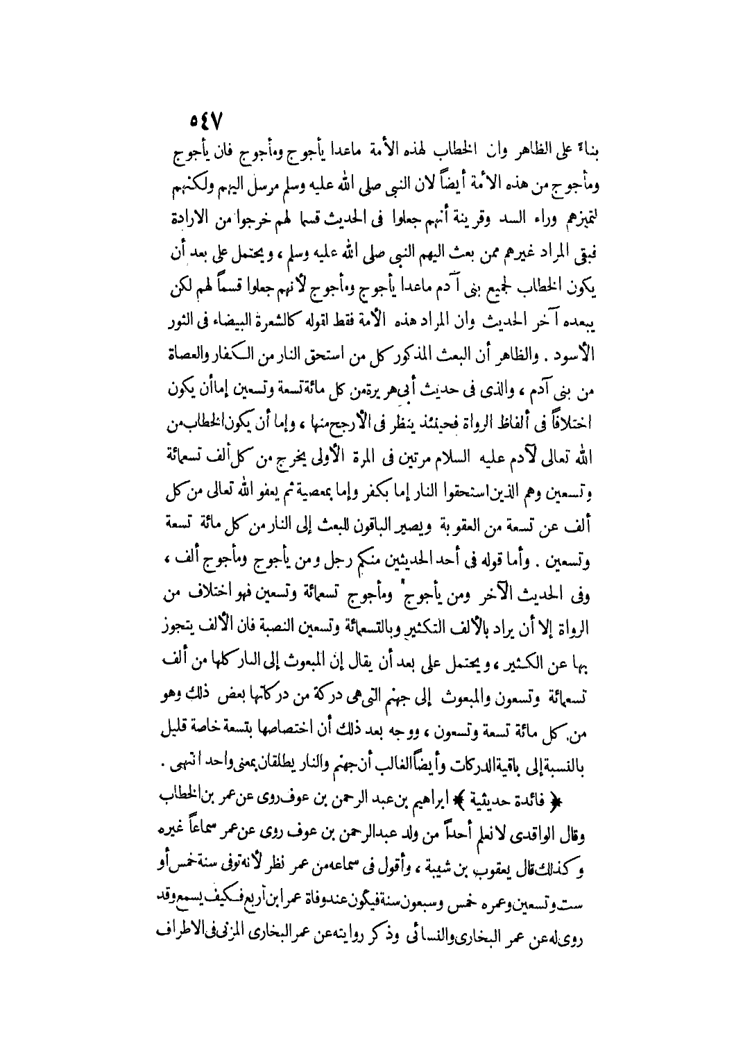 وَأَمَّا قَوْلُهُ فِي أَحَدِ الْحَدِيثَيْنِ مِنْكُمْ رَجُلٌ وَمِنْ يَأْجُوجَ وَمَأْجُوجَ أَلْفٌ، وَفِي الْحَدِيثِ الْآخَرِ «وَمِنْ يَأْجُوجَ وَمَأْجُوجَ تِسْعَمِائَةٍ وَتِسْعِينَ» فَهُوَ اخْتِلَافٌ مِنْ الرُّوَاةِ إلَّا أَنْ يُرَادَ بِالْأَلْفِ التَّكْثِيرُ وَبِالتِّسْعِمِائَةِ وَتِسْعِينَ النُّصْبَةُ فَإِنَّ الْأَلْفَ يُتَجَوَّزُ بِهَا عَنْ الْكَثِيرِ، وَيَحْتَمِلُ عَلَى بُعْدٍ أَنْ يُقَالَ: إنَّ الْمَبْعُوثَ إلَى النَّارِ كُلَّهُ مِنْ أَلْفٍ تِسْعُمِائَةٍ وَتِسْعُونَ وَالْمَبْعُوثُ إلَى جَهَنَّمَ الَّتِي هِيَ دَرَكَةٌ مِنْ دَرَكَاتِهَا بَعْضُ ذَلِكَ وَهُوَ مِنْ كُلِّ مِائَةٍ تِسْعَةٌ وَتِسْعُونَ، وَوُجِّهَ بَعْدَ ذَلِكَ أَنَّ اخْتِصَاصَهَا بِتِسْعَةٍ خَاصَّةً قَلِيلٌ بِالنِّسْبَةِ إلَى بَاقِيَةِ الدَّرَكَاتِ، وَأَيْضًا الْغَالِبُ أَنَّ جَهَنَّمَ وَالنَّارَ يُطْلَقَانِ بِمَعْنًى وَاحِدٍ. انْتَهَى.