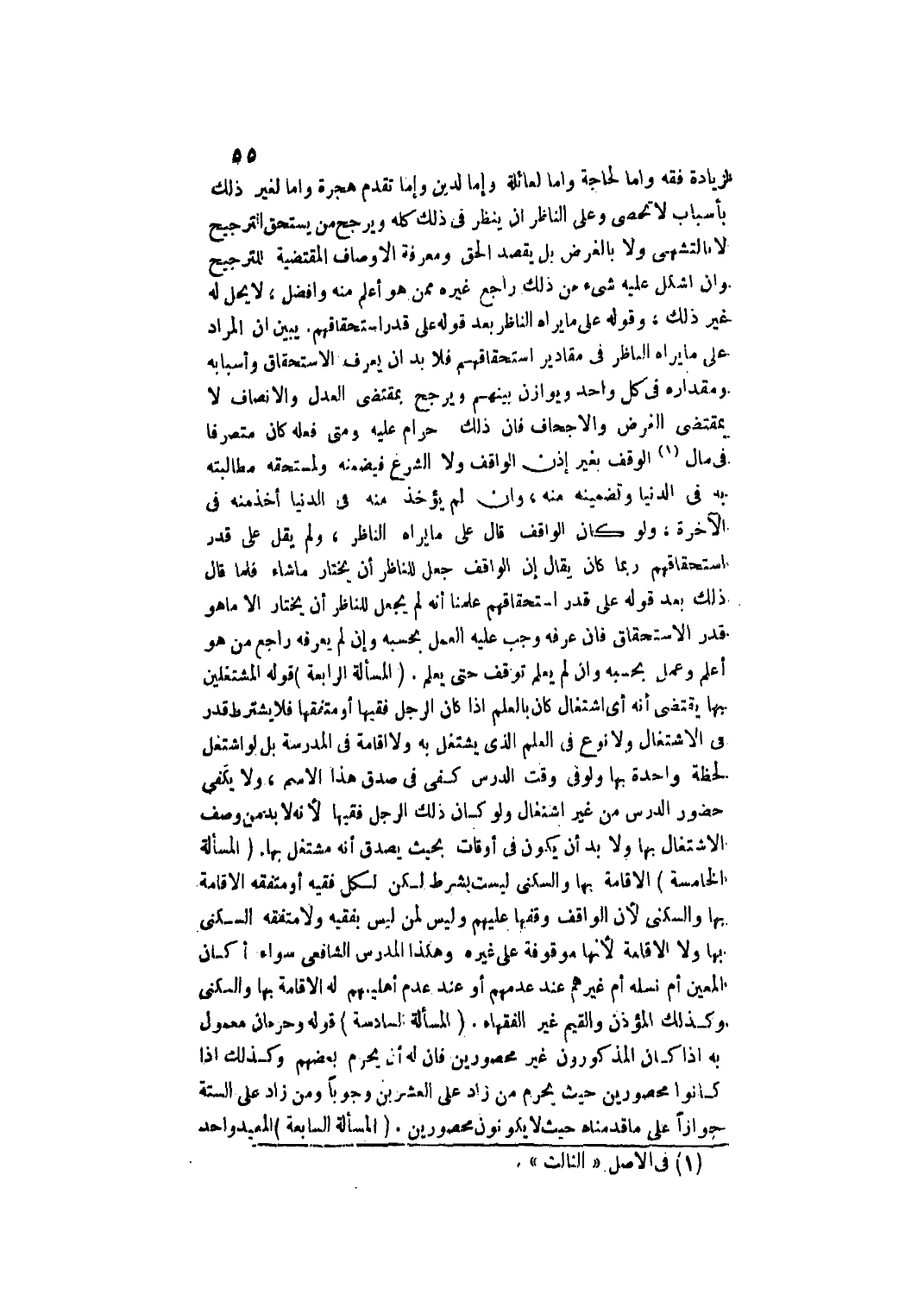 لِزِيَادَةِ فِقْهٍ وَإِمَّا لِحَاجَةٍ وَإِمَّا لِعَائِلَةٍ وَإِمَّا لِدِينٍ وَإِمَّا تَقَدُّمِ هِجْرَةٍ وَإِمَّا لِغَيْرِ ذَلِكَ بِأَسْبَابٍ لَا تُحْصَى وَعَلَى النَّاظِرِ أَنْ يَنْظُرَ فِي ذَلِكَ كُلِّهِ وَيُرَجِّحَ مَنْ يَسْتَحِقُّ التَّرْجِيحَ لَا بِالتَّشَهِّي وَلَا بِالْغَرَضِ بَلْ يَقْصِدُ الْحَقَّ وَمَعْرِفَةَ الْأَوْصَافِ الْمُقْتَضِيَةِ لِلتَّرْجِيحِ وَإِنْ أَشْكَلَ عَلَيْهِ شَيْءٌ مِنْ ذَلِكَ رَاجَعَ غَيْرَهُ مِمَّنْ هُوَ أَعْلَمُ مِنْهُ وَأَفْضَلُ، لَا يَحِلُّ لَهُ غَيْرُ ذَلِكَ، وَقَوْلُهُ عَلَى مَا يَرَاهُ النَّاظِرُ بَعْدَ قَوْلِهِ عَلَى قَدْرِ اسْتِحْقَاقِهِمْ.