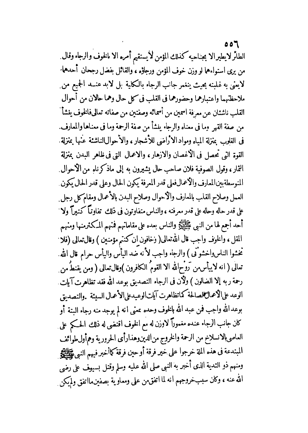 الطَّائِرَ لَا يَطِيرُ إلَّا بِجَنَاحَيْهِ كَذَلِكَ الْمُؤْمِنُ لَا يَسْتَقِيمُ أَمْرُهُ إلَّا بِالْخَوْفِ وَالرَّجَاءِ، وَقَالَ مَنْ يَرَى اسْتِوَاءَهُمَا: لَوْ وُزِنَ خَوْفُ الْمُؤْمِنِ وَرَجَاؤُهُ، وَالْقَائِلُ بِفَضْلِ رُجْحَانِ أَحَدِهِمَا لَا يَعْنِي بِهِ غَلَبَتَهُ بِحَيْثُ يَنْغَمِرُ جَانِبُ الرَّجَاءِ بِالْكُلِّيَّةِ بَلْ لَا بُدَّ عِنْدَ الْجَمِيعِ مِنْ مُلَاحَظَتِهِمَا وَاعْتِبَارِهِمَا وَحُضُورِهِمَا فِي الْقَلْبِ فِي كُلِّ حَالٍ وَهُمَا حَالَانِ مِنْ أَحْوَالِ الْقَلْبِ نَاشِئَانِ عَنْ مَعْرِفَةِ اسْمَيْنِ مِنْ أَسْمَائِهِ وَصِفَتَيْنِ مِنْ صِفَاتِهِ تَعَالَى فَالْخَوْفُ يَنْشَأُ مِنْ صِفَةِ الْقَهْرِ وَمَا فِي مَعْنَاهُ وَالرَّجَاءُ يَنْشَأُ مِنْ صِفَةِ الرَّحْمَةِ وَمَا فِي مَعْنَاهَا وَالْمَعَارِفُ فِي الْقُلُوبِ بِمَنْزِلَةِ الْمِيَاهِ وَمَوَادِّ الْأَرَاضِي لِلْأَشْجَارِ، وَالْأَحْوَالُ النَّاشِئَةُ عَنْهَا بِمَنْزِلَةِ الْقُوَّةِ الَّتِي تَحْصُلُ فِي الْأَغْصَانِ وَالْأَزْهَارِ، وَالْأَعْمَالُ الَّتِي فِي ظَاهِرِ الْبَدَنِ بِمَنْزِلَةِ الثِّمَارِ.