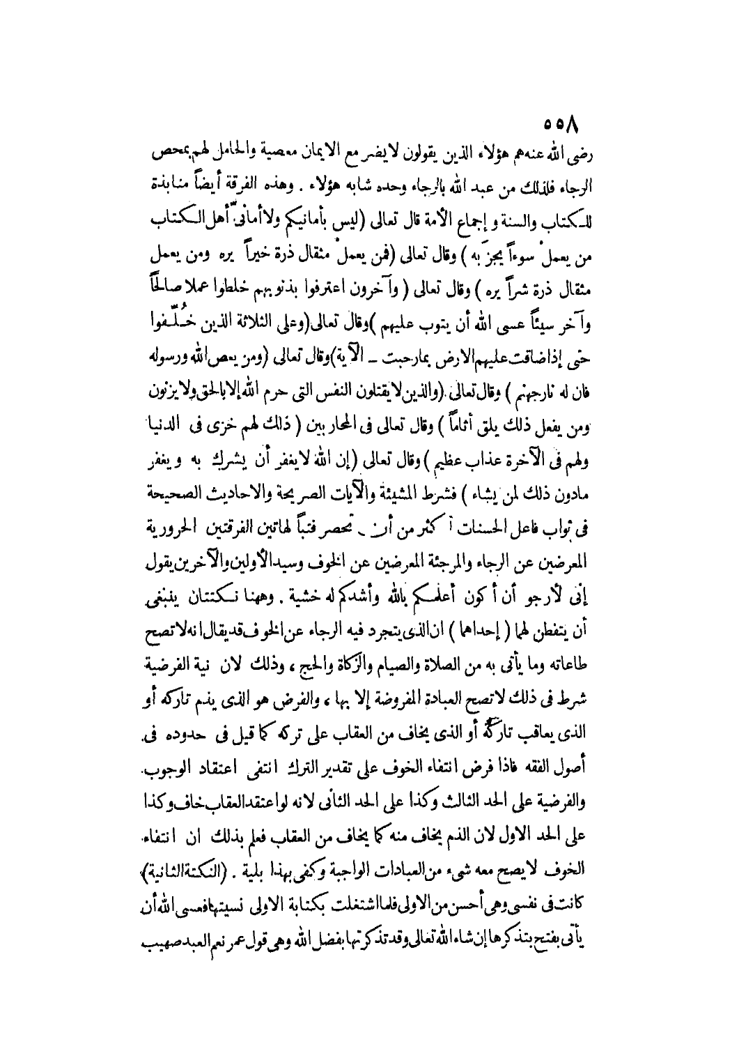 وَهَذِهِ الْفِرْقَةُ أَيْضًا مُنَابِذَةٌ لِلْكِتَابِ وَالسُّنَّةِ وَإِجْمَاعِ الْأُمَّةِ قَالَ تَعَالَى {لَيْسَ بِأَمَانِيِّكُمْ وَلا أَمَانِيِّ أَهْلِ الْكِتَابِ مَنْ يَعْمَلْ سُوءًا يُجْزَ بِهِ} [النساء: 123] وَقَالَ تَعَالَى {فَمَنْ يَعْمَلْ مِثْقَالَ ذَرَّةٍ خَيْرًا يَرَهُ} [الزلزلة: 7] {وَمَنْ يَعْمَلْ مِثْقَالَ ذَرَّةٍ شَرًّا يَرَهُ} [الزلزلة: 8] وَقَالَ تَعَالَى {وَآخَرُونَ اعْتَرَفُوا بِذُنُوبِهِمْ خَلَطُوا عَمَلا صَالِحًا وَآخَرَ سَيِّئًا عَسَى اللَّهُ أَنْ يَتُوبَ عَلَيْهِمْ} [التوبة: 102] وَقَالَ تَعَالَى {وَعَلَى الثَّلاثَةِ الَّذِينَ خُلِّفُوا حَتَّى إِذَا ضَاقَتْ عَلَيْهِمُ الأَرْضُ بِمَا رَحُبَتْ} [التوبة: 118]- الْآيَةَ وَقَالَ تَعَالَى {وَمَنْ يَعْصِ اللَّهَ وَرَسُولَهُ فَإِنَّ لَهُ نَارَ جَهَنَّمَ} [الجن: 23] وَقَالَ تَعَالَى {وَالَّذِينَ لا يَدْعُونَ مَعَ اللَّهِ إِلَهًا آخَرَ وَلا يَقْتُلُونَ النَّفْسَ الَّتِي حَرَّمَ اللَّهُ إِلا بِالْحَقِّ وَلا يَزْنُونَ وَمَنْ يَفْعَلْ ذَلِكَ يَلْقَ أَثَامًا} [الفرقان: 68] وَقَالَ تَعَالَى فِي الْمُحَارَبِينَ {ذَلِكَ لَهُمْ خِزْيٌ فِي الدُّنْيَا وَلَهُمْ فِي الآخِرَةِ عَذَابٌ عَظِيمٌ} [المائدة: 33] وَقَالَ تَعَالَى {إِنَّ اللَّهَ لا يَغْفِرُ أَنْ يُشْرَكَ بِهِ وَيَغْفِرُ مَا دُونَ ذَلِكَ لِمَنْ يَشَاءُ} [النساء: 48] فَشَرَطَ الْمَشِيئَةَ وَالْآيَاتُ الصَّرِيحَةُ وَالْأَحَادِيثُ الصَّحِيحَةُ فِي ثَوَابِ فَاعِلِ الْحَسَنَاتِ أَكْثَرُ مِنْ أَنْ تُحْصَرَ فَتَبًّا لِهَاتَيْنِ الْفِرْقَتَيْنِ الْحَرُورِيَّةِ الْمُعْرِضِينَ عَنْ الرَّجَاءِ وَالْمُرْجِئَةِ الْمُعْرِضِينَ عَنْ الْخَوْفِ وَسَيِّدُ الْأَوَّلِينَ وَالْآخِرِينَ يَقُولُ: إنِّي لَأَرْجُو أَنْ أَكُونَ أَعْلَمَكُمْ بِاَللَّهِ وَأَشَدَّكُمْ لَهُ خَشْيَةً.
