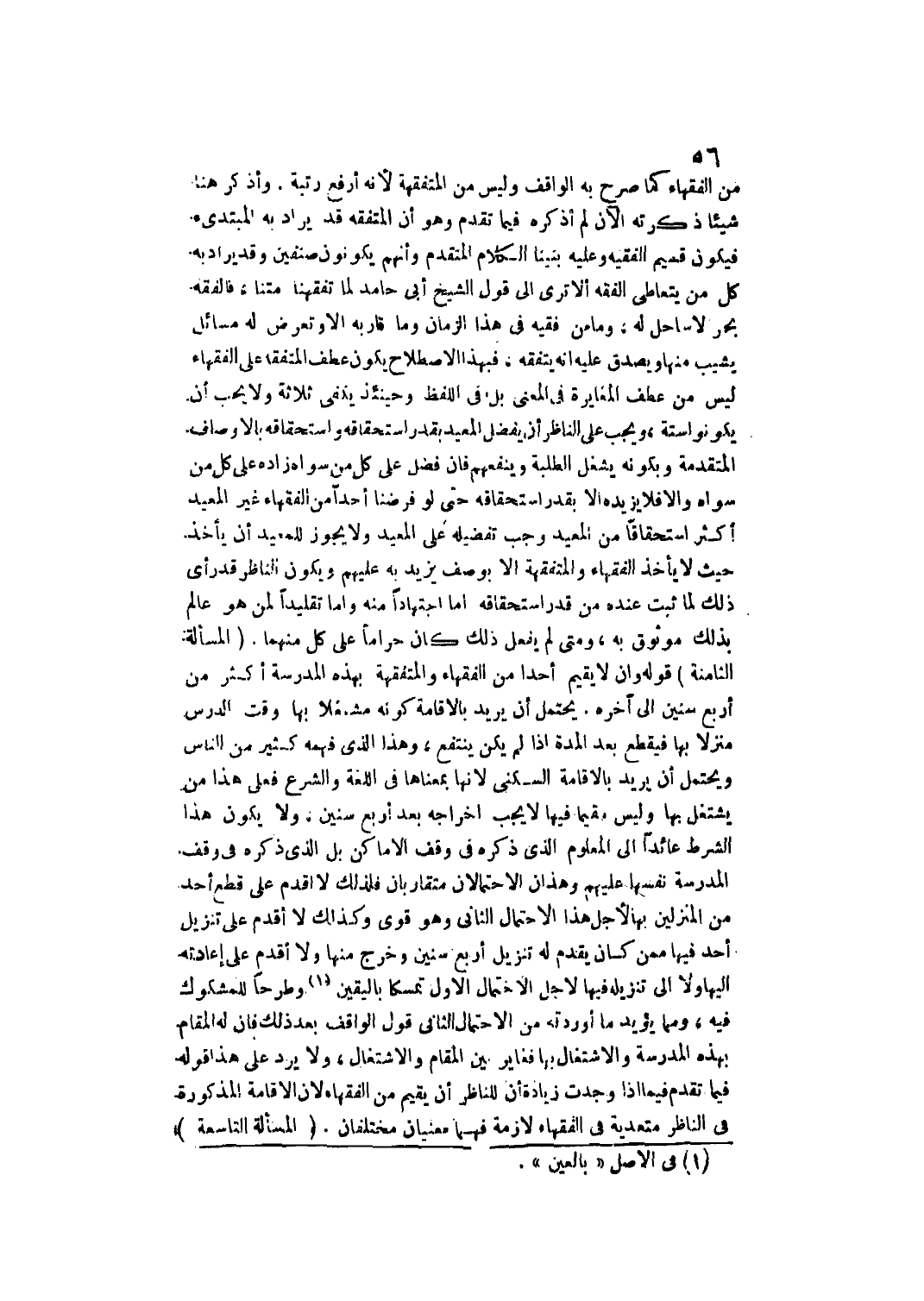 وَأَذْكُرُ هُنَا شَيْئًا ذَكَرْته الْآنَ لَمْ أَذْكُرْهُ فِيمَا تَقَدَّمَ وَهُوَ أَنَّ الْمُتَفَقِّهَ قَدْ يُرَادُ بِهِ الْمُبْتَدِئُ فَيَكُونُ قَسِيمَ الْفَقِيهِ وَعَلَيْهِ بَنَيْنَا الْكَلَامَ الْمُتَقَدِّمَ وَأَنَّهُمْ يَكُونُونَ صِنْفَيْنِ وَقَدْ يُرَادُ بِهِ كُلُّ مَنْ يَتَعَاطَى الْفِقْهَ أَلَا تَرَى إلَى قَوْلِ الشَّيْخِ أَبِي حَامِدٍ لَمَّا تَفَقَّهْنَا مُتْنَا، فَالْفِقْهُ بَحْرٌ لَا سَاحِلَ لَهُ، وَمَا مِنْ فَقِيهٍ فِي هَذَا الزَّمَانِ وَمَا قَارَبَهُ إلَّا وَتَعْرِضُ لَهُ مَسَائِلُ يَشِيبُ مِنْهَا وَيَصْدُقُ عَلَيْهِ أَنَّهُ يَتَفَقَّهُ، فَبِهَذَا الِاصْطِلَاحِ يَكُونُ عَطْفُ الْمُتَفَقِّهِ عَلَى الْفُقَهَاءِ لَيْسَ مِنْ عَطْفِ الْمُغَايَرَةِ فِي الْمَعْنَى بَلْ فِي اللَّفْظِ وَحِينَئِذٍ يَكْفِي ثَلَاثَةٌ وَلَا يَجِبُ أَنْ يَكُونُوا سِتَّةً، وَيَجِبُ عَلَى النَّاظِرِ أَنْ يُفَضِّلَ الْمُعِيدَ بِقَدْرِ اسْتِحْقَاقِهِ وَاسْتِحْقَاقُهُ بِالْأَوْصَافِ الْمُتَقَدِّمَةِ وَبِكَوْنِهِ يُشْغِلُ الطَّلَبَةَ وَيَنْفَعُهُمْ فَإِنْ فَضَلَ عَلَى كُلِّ مَنْ سِوَاهُ زَادَهُ عَلَى كُلِّ مَنْ سِوَاهُ وَإِلَّا فَلَا يَزِيدُهُ إلَّا بِقَدْرِ اسْتِحْقَاقِهِ حَتَّى لَوْ فَرَضْنَا أَحَدًا مِنْ الْفُقَهَاءِ غَيْرَ الْمُعِيدِ أَكْثَرَ اسْتِحْقَاقًا مِنْ الْمُعِيدِ وَجَبَ تَفْضِيلُهُ عَلَى الْمُعِيدِ وَلَا يَجُوزُ لِلْمُعِيدِ أَنْ يَأْخُذَ حَيْثُ لَا يَأْخُذُ الْفُقَهَاءُ وَالْمُتَفَقِّهَةُ إلَّا بِوَصْفٍ يَزِيدُ بِهِ عَلَيْهِمْ وَيَكُونُ النَّاظِرُ قَدْ رَأَى ذَلِكَ لِمَا ثَبَتَ عِنْدَهُ مِنْ قَدْرِ اسْتِحْقَاقِهِ إمَّا اجْتِهَادًا مِنْهُ وَإِمَّا تَقْلِيدًا لِمَنْ هُوَ عَالِمٌ بِذَلِكَ مَوْثُوقٌ بِهِ، وَمَتَى لَمْ يَفْعَلْ ذَلِكَ كَانَ حَرَامًا عَلَى كُلٍّ مِنْهُمَا.