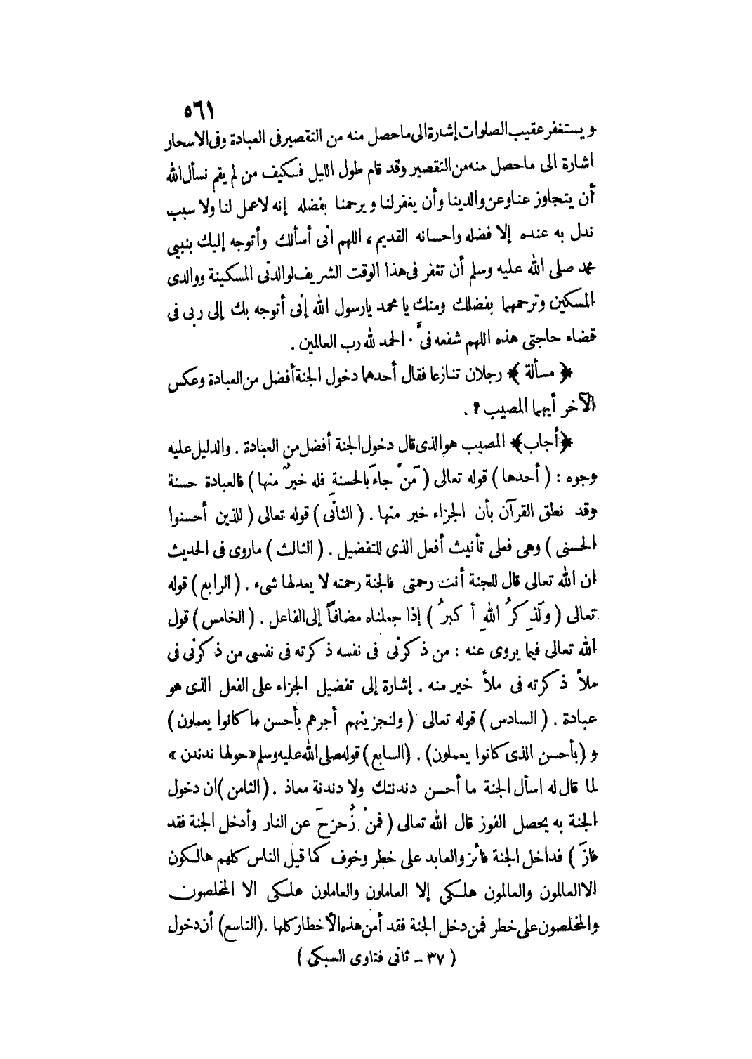 (أَجَابَ) الْمُصِيبُ هُوَ الَّذِي قَالَ: دُخُولُ الْجَنَّةِ أَفْضَلُ مِنْ الْعِبَادَةِ وَالدَّلِيلُ عَلَيْهِ وُجُوهٌ: