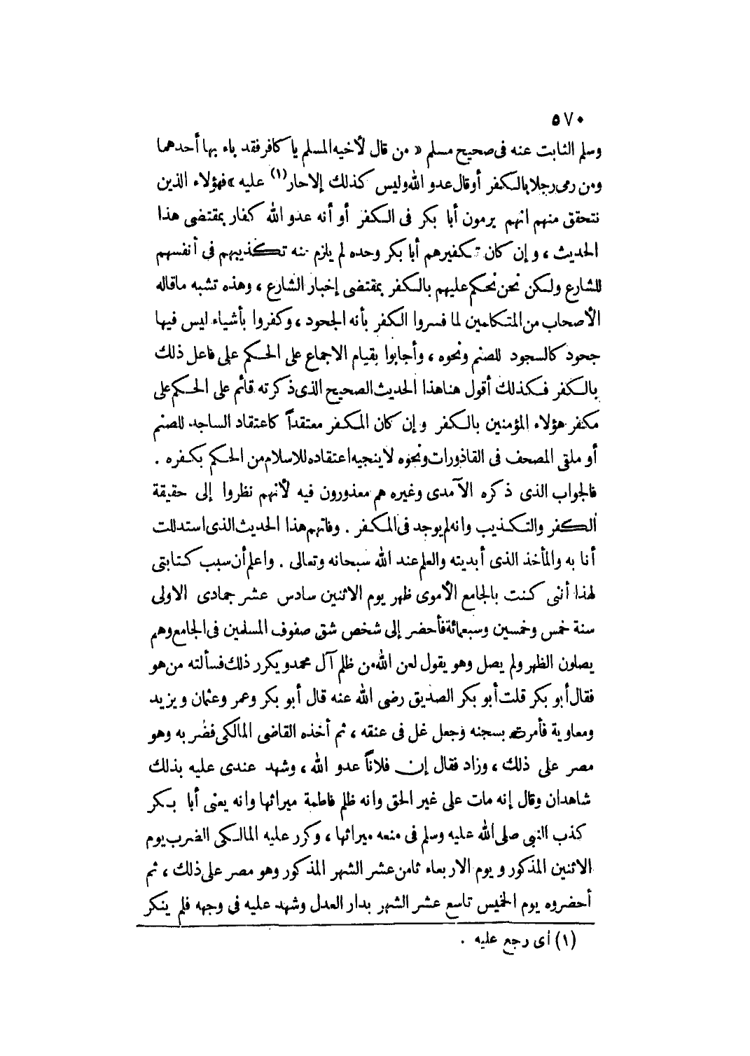 الثَّابِتُ عَنْهُ فِي صَحِيحِ مُسْلِمٍ «مَنْ قَالَ لِأَخِيهِ الْمُسْلِمِ: يَا كَافِرُ فَقَدْ بَاءَ بِهَا أَحَدُهُمَا وَمَنْ رَمَى رَجُلًا بِالْكُفْرِ أَوْ قَالَ: عَدُوُّ اللَّهِ وَلَيْسَ كَذَلِكَ إلَّا حَارَ عَلَيْهِ» فَهَؤُلَاءِ الَّذِينَ نَتَحَقَّقُ مِنْهُمْ أَنَّهُمْ يَرْمُونَ أَبَا بَكْرٍ فِي الْكُفْرِ أَوْ أَنَّهُ عَدُوُّ اللَّهِ كُفَّارٌ بِمُقْتَضَى هَذَا الْحَدِيثِ، وَإِنْ كَانَ تَكْفِيرُهُمْ أَبَا بَكْرٍ وَحْدَهُ لَمْ يَلْزَمْ عَنْهُ تَكْذِيبُهُمْ فِي أَنْفُسِهِمْ لِلشَّارِعِ وَلَكِنْ نَحْنُ نَحْكُمُ عَلَيْهِمْ بِالْكُفْرِ بِمُقْتَضَى إخْبَارِ الشَّارِعِ، وَهَذِهِ تُشْبِهُ مَا قَالَهُ الْأَصْحَابُ مِنْ الْمُتَكَلِّمِينَ لَمَّا فَسَّرُوا الْكُفْرَ بِأَنَّهُ الْجُحُودُ، وَكَفَّرُوا بِأَشْيَاءَ لَيْسَ فِيهَا جُحُودٌ كَالسُّجُودِ لِلصَّنَمِ وَنَحْوِهِ، وَأَجَابُوا بِقِيَامِ الْإِجْمَاعِ عَلَى الْحُكْمِ عَلَى فَاعِلِ ذَلِكَ بِالْكُفْرِ فَكَذَلِكَ أَقُولُ هُنَا هَذَا الْحَدِيثُ الصَّحِيحُ الَّذِي ذَكَرْتُهُ قَائِمٌ عَلَى الْحُكْمِ عَلَى مُكَفِّرِ هَؤُلَاءِ الْمُؤْمِنِينَ بِالْكُفْرِ وَإِنْ كَانَ الْمُكَفِّرُ مُعْتَقِدًا كَاعْتِقَادِ السَّاجِدِ لِلصَّنَمِ أَوْ مُلْقِي الْمُصْحَفِ فِي الْقَاذُورَاتِ وَنَحْوِهِ لَا يُنْجِيهِ اعْتِقَادُهُ لِلْإِسْلَامِ مِنْ الْحُكْمِ بِكُفْرِهِ.
