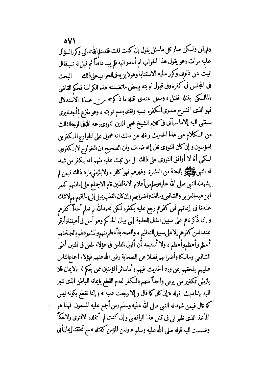 وَسَهَّلَ عِنْدِي قَتْلَهُ مَا ذَكَرْتُهُ مِنْ هَذَا الِاسْتِدْلَالِ فَهُوَ الَّذِي انْشَرَحَ صَدْرِي لِكُفْرِهِ بِسَبِّهِ وَلِقَتْلِهِ بِعَدَمِ تَوْبَتِهِ، وَهُوَ مَنْزَعٌ لَمْ أَجِدْ غَيْرِي سَبَقَنِي إلَيْهِ إلَّا مَا سَيَأْتِي فِي كَلَامِ الشَّيْخِ مُحْيِي الدِّينِ النَّوَوِيِّ - رَحِمَهُ اللَّهُ - فِي الْوَجْهِ الثَّالِثِ مِنْ الْكَلَامِ عَلَى هَذَا الْحَدِيثِ وَنَقَلَهُ عَنْ مَالِكٍ أَنَّهُ مَحْمُولٌ عَلَى الْخَوَارِجِ الْمُكَفِّرِينَ لِلْمُؤْمِنِينَ وَإِنْ كَانَ النَّوَوِيُّ قَالَ: إنَّهُ ضَعِيفٌ وَأَنَّ الصَّحِيحَ أَنَّ الْخَوَارِجَ لَا يُكَفِّرُونَ لَكِنِّي أَنَا لَا أُوَافِقُ النَّوَوِيَّ عَلَى ذَلِكَ بَلْ مَنْ ثَبَتَ عَلَيْهِ مِنْهُمْ أَنَّهُ يُكَفِّرُ مَنْ شَهِدَ لَهُ النَّبِيُّ - صَلَّى اللَّهُ عَلَيْهِ وَسَلَّمَ - بِالْجَنَّةِ مِنْ الْعَشَرَةِ وَغَيْرِهِمْ فَهُوَ كَافِرٌ، وَلَا يَلْزَمُنِي طَرْدُ ذَلِكَ فِيمَنْ لَمْ يَشْهَدْ لَهُ النَّبِيُّ - صَلَّى اللَّهُ عَلَيْهِ وَسَلَّمَ - مِنْ أَعْلَامِ الْأُمَّةِ الَّذِينَ قَامَ الْإِجْمَاعُ عَلَى إمَامَتِهِمْ كَعُمَرَ بْنِ عَبْدِ الْعَزِيزِ وَالشَّافِعِيِّ وَمَالِكٍ وَأَضْرَابِهِمْ وَإِنْ كَانَ الْقَلْبُ يَمِيلُ إلَى إلْحَاقِهِمْ بِهِمْ لَا شَكَّ عِنْدَنَا فِي إيمَانِهِمْ فَمَنْ كَفَّرَهُمْ رُجِعَ عَلَيْهِ بِكُفْرِهِ لَكِنْ نَحْمَدُ اللَّهَ لَمْ نَعْلَمْ أَحَدًا كَفَّرَهُمْ وَإِنَّمَا ذَكَرْنَاهُمْ عَلَى سَبِيلِ الْمِثَالِ لِلْحَاجَةِ إلَى بَيَانِ الْحُكْمِ وَهُوَ أَجَلُّ فِي أَعْيُنِنَا وَأَوْقَرُ عِنْدَنَا مِنْ كُفْرِهِمْ إلَّا عَلَى سَبِيلِ التَّعْظِيمِ.