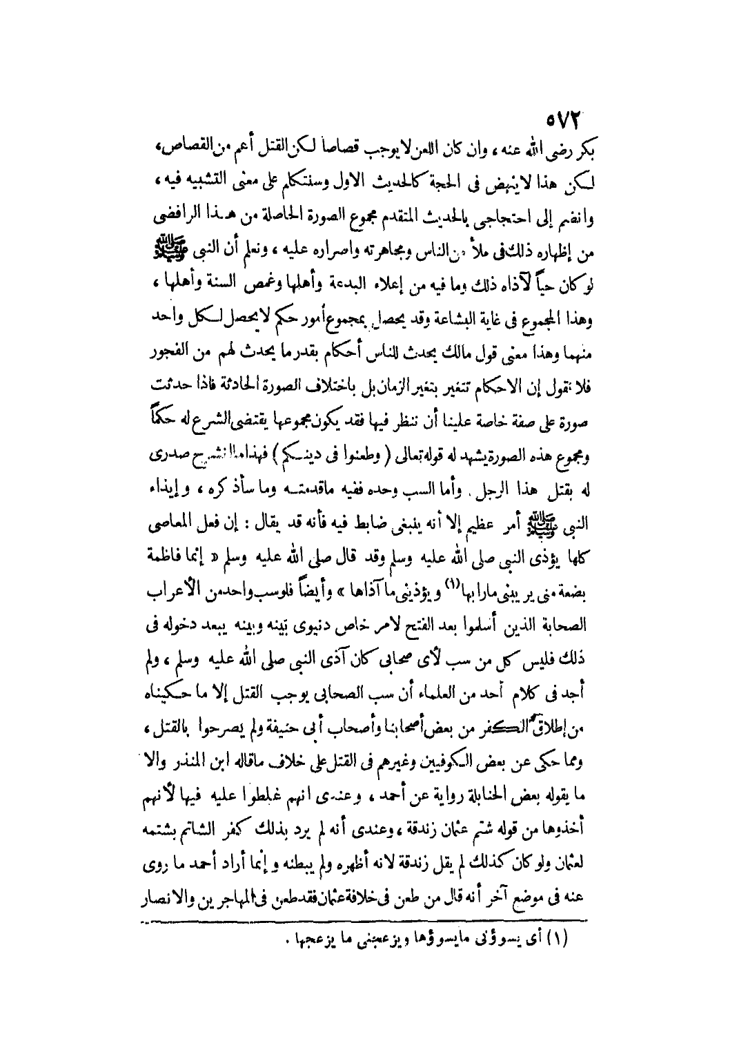 وَإِنْ كَانَ اللَّعْنُ لَا يُوجِبُ قِصَاصًا لَكِنَّ الْقَتْلَ أَعَمُّ مِنْ الْقِصَاصِ، لَكِنَّ هَذَا لَا يَنْهَضُ فِي الْحُجَّةِ كَالْحَدِيثِ الْأَوَّلِ وَسَنَتَكَلَّمُ عَلَى مَعْنَى التَّشْبِيهِ فِيهِ، وَانْضَمَّ إلَى احْتِجَاجِي بِالْحَدِيثِ الْمُتَقَدِّمِ مَجْمُوعُ الصُّورَةِ الْحَاصِلَةِ مِنْ هَذَا الرَّافِضِيِّ مِنْ إظْهَارِهِ ذَلِكَ فِي مَلَأٍ مِنْ النَّاسِ وَمُجَاهَرَتِهِ وَإِصْرَارِهِ عَلَيْهِ، وَنَعْلَمُ أَنَّ النَّبِيَّ - صَلَّى اللَّهُ عَلَيْهِ وَسَلَّمَ - لَوْ كَانَ حَيًّا لَآذَاهُ ذَلِكَ وَمَا فِيهِ مِنْ إعْلَاءِ الْبِدْعَةِ وَأَهْلِهَا وَغَمَصِ السُّنَّةِ وَأَهْلِهَا، وَهَذَا الْمَجْمُوعُ فِي غَايَةِ الْبَشَاعَةِ وَقَدْ يَحْصُلُ بِمَجْمُوعِ أُمُورٍ حُكْمٌ لَا يَحْصُلُ لِكُلِّ وَاحِدٍ مِنْهُمَا وَهَذَا مَعْنَى قَوْلِ مَالِكٍ يَحْدُثُ لِلنَّاسِ أَحْكَامٌ بِقَدْرِ مَا يَحْدُثُ لَهُمْ مِنْ الْفُجُورِ فَلَا نَقُولُ: إنَّ الْأَحْكَامَ تَتَغَيَّرُ بِتَغَيُّرِ الزَّمَانِ بَلْ بِاخْتِلَافِ الصُّورَةِ الْحَادِثَةِ فَإِذَا حَدَثَتْ صُورَةٌ عَلَى صِفَةٍ خَاصَّةٍ عَلَيْنَا أَنْ نَنْظُرَ فِيهَا فَقَدْ يَكُونُ مَجْمُوعُهَا يَقْتَضِي الشَّرْعُ لَهُ حُكْمًا وَمَجْمُوعُ هَذِهِ الصُّورَةِ يَشْهَدُ لَهُ قَوْله تَعَالَى {وَطَعَنُوا فِي دِينِكُمْ} [التوبة: 12] فَهَذَا مَا انْشَرَحَ صَدْرِي لَهُ بِقَتْلِ هَذَا الرَّجُلِ.