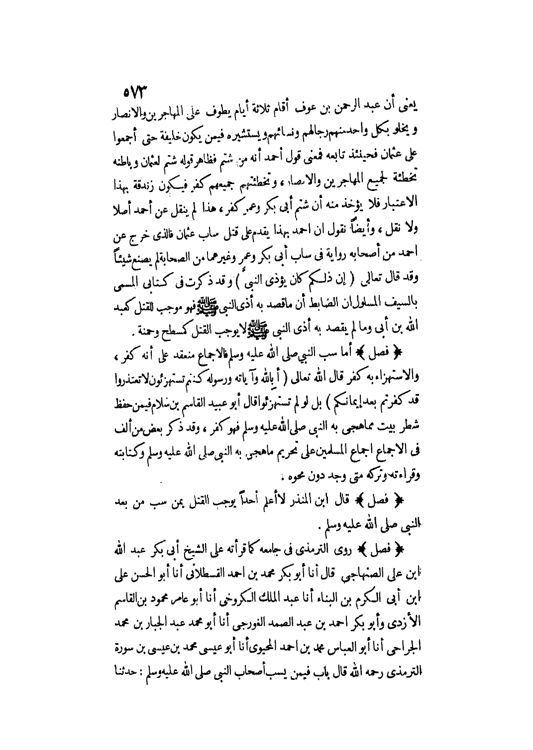 (فَصْلٌ) قَالَ ابْنُ الْمُنْذِرِ لَا أَعْلَمُ أَحَدًا يُوجِبُ الْقَتْلَ بِمَنْ سُبَّ مِنْ بَعْدِ النَّبِيِّ - صَلَّى اللَّهُ عَلَيْهِ وَسَلَّمَ -.