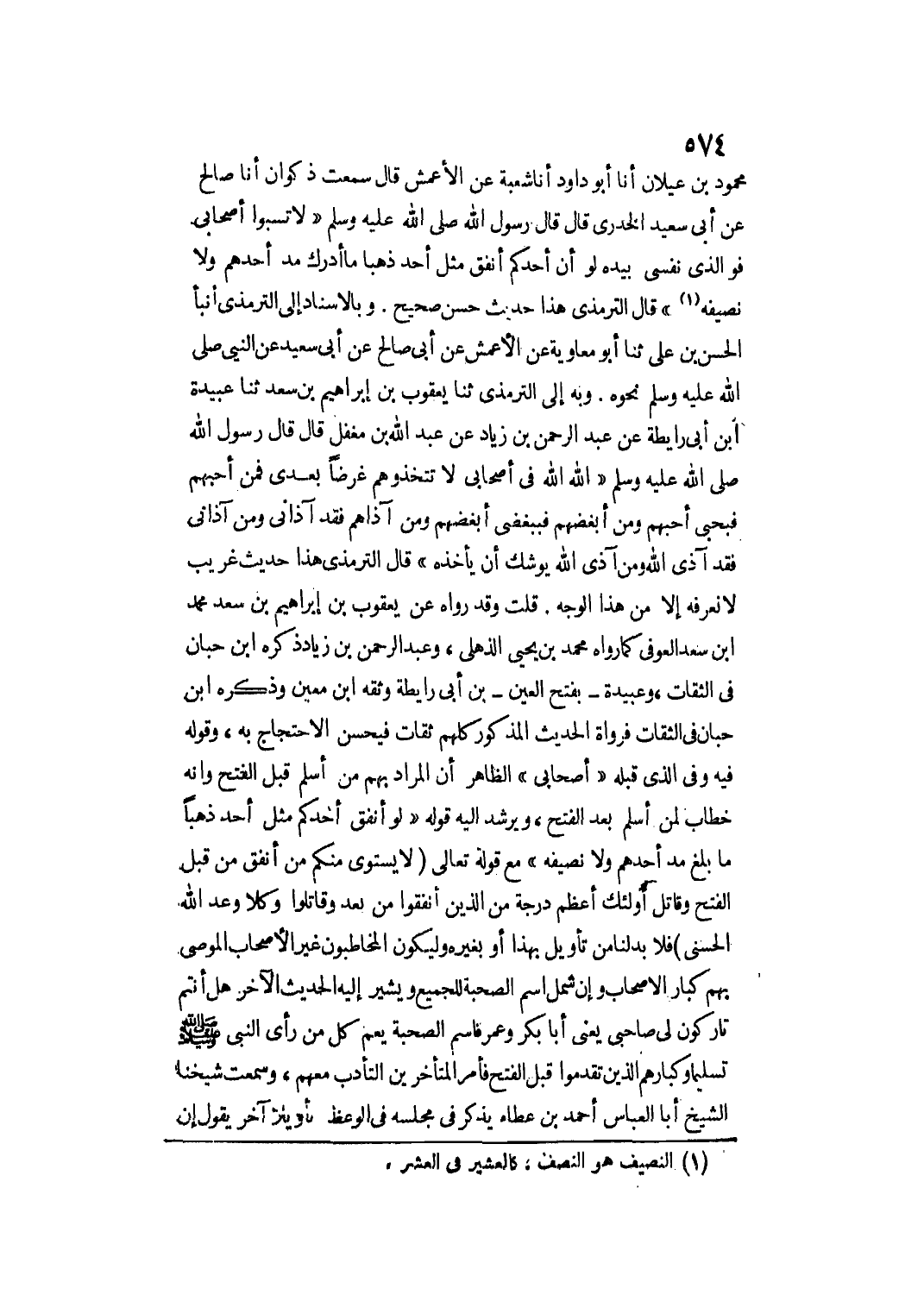 مَحْمُودُ بْنُ غَيْلَانَ أَنَا أَبُو دَاوُد أَنَا شُعْبَةُ عَنْ الْأَعْمَشِ قَالَ: سَمِعْت ذَكْوَانَ أَنَا صَالِحٌ عَنْ أَبِي سَعِيدٍ الْخُدْرِيِّ قَالَ: قَالَ رَسُولُ اللَّهِ - صَلَّى اللَّهُ عَلَيْهِ وَسَلَّمَ - «لَا تَسُبُّوا أَصْحَابِي فَوَاَلَّذِي نَفْسِي بِيَدِهِ لَوْ أَنَّ أَحَدَكُمْ أَنْفَقَ مِثْلَ أُحُدٍ ذَهَبًا مَا أَدْرَكَ مُدَّ أَحَدِهِمْ وَلَا نَصِيفَهُ» قَالَ التِّرْمِذِيُّ: هَذَا حَدِيثٌ حَسَنٌ صَحِيحٌ.