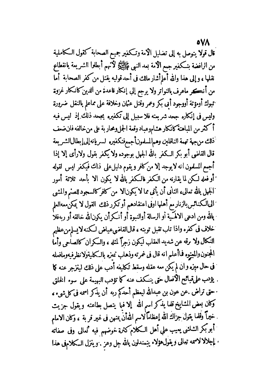 قَالَ قَوْلًا يُتَوَصَّلُ بِهِ إلَى تَضْلِيلِ الْأُمَّةِ وَتَكْفِيرِ جَمِيعِ الصَّحَابَةِ كَقَوْلِ الْكَامِلِيَّةِ مِنْ الرَّافِضَةِ بِتَكْفِيرِ جَمْعِ الْأُمَّةِ بَعْدَ النَّبِيِّ - صَلَّى اللَّهُ عَلَيْهِ وَسَلَّمَ - لِأَنَّهُمْ أَبْطَلُوا الشَّرِيعَةَ بِانْقِطَاعِ نَقْلِهَا، وَإِلَى هَذَا وَاَللَّهُ أَعْلَمُ أَشَارَ مَالِكٌ فِي أَحَدِ قَوْلَيْهِ يُقْتَلُ مَنْ كَفَّرَ الصَّحَابَةَ أَمَّا مَنْ أَنْكَرَ مَا عُرِفَ بِالتَّوَاتُرِ وَلَا يَرْجِعُ إلَى إنْكَارِ قَاعِدَةٍ مِنْ الدِّينِ كَإِنْكَارِ غَزْوَةِ تَبُوكَ أَوْ مُؤْتَةَ أَوْ وُجُودِ أَبِي بَكْرٍ وَعُمَرَ وَقَتْلِ عُثْمَانَ وَخِلَافَةِ عَلِيٍّ مِمَّا عُلِمَ بِالنَّقْلِ ضَرُورَةً وَلَيْسَ فِي إنْكَارِهِ جَحْدُ شَرِيعَتِهِ فَلَا سَبِيلَ إلَى تَكْفِيرِهِ بِجَحْدِ ذَلِكَ إذْ لَيْسَ فِيهِ أَكْثَرُ مِنْ الْمُبَاهَتَةِ كَإِنْكَارِ هِشَامٍ وَعَبَّادٍ وَقْعَةَ الْجَمَلِ وَمُحَارَبَةَ عَلِيٍّ مَنْ خَالَفَهُ فَإِنَّ ضَعْفَ ذَلِكَ مِنْ جِهَةِ تُهْمَةِ النَّاقِلِينَ وَهُمْ الْمُسْلِمُونَ أَجْمَعَ فَتَكْفِيرُهُ لِسَرَيَانِهِ إلَى إبْطَالِ الشَّرِيعَةِ.