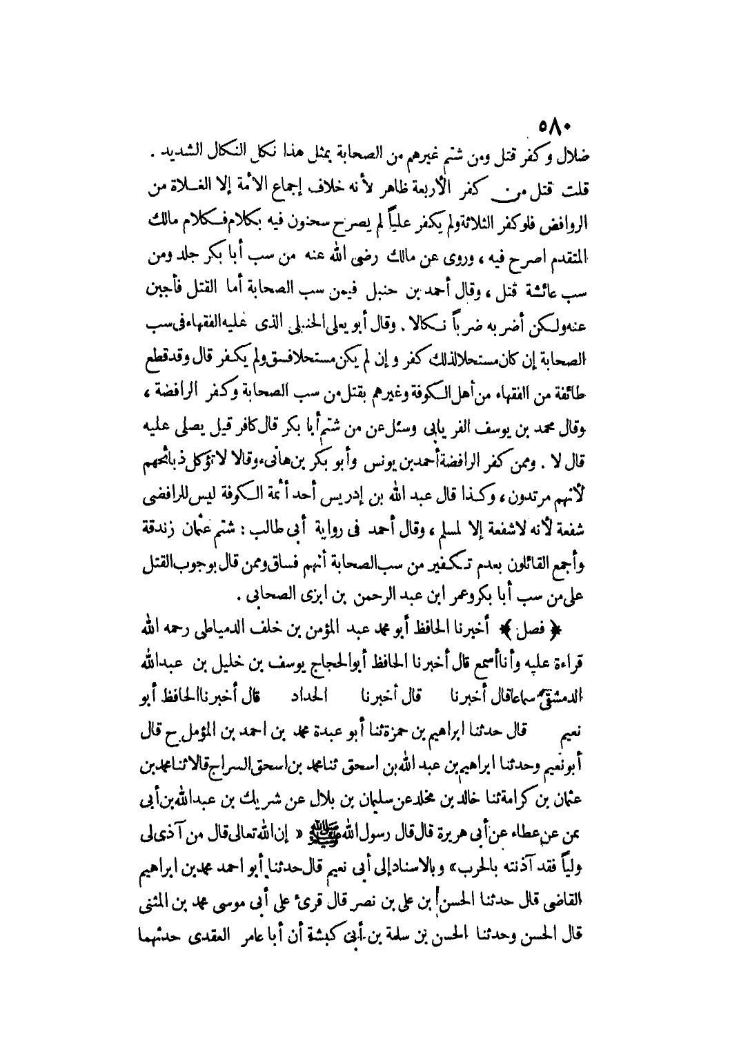 وَقَالَ أَبُو يَعْلَى الْحَنْبَلِيُّ الَّذِي عَلَيْهِ الْفُقَهَاءُ فِي سَبِّ الصَّحَابَةِ إنْ كَانَ مُسْتَحِلًّا لِذَلِكَ كُفِّرَ وَإِنْ لَمْ يَكُنْ مُسْتَحِلًّا فُسِّقَ وَلَمْ يُكَفَّرْ، قَالَ: وَقَدْ قَطَعَ طَائِفَةٌ مِنْ الْفُقَهَاءِ مِنْ أَهْلِ الْكُوفَةِ وَغَيْرِهِمْ بِقَتْلِ مَنْ سَبَّ الصَّحَابَةَ وَكُفْرِ الرَّافِضَةِ.