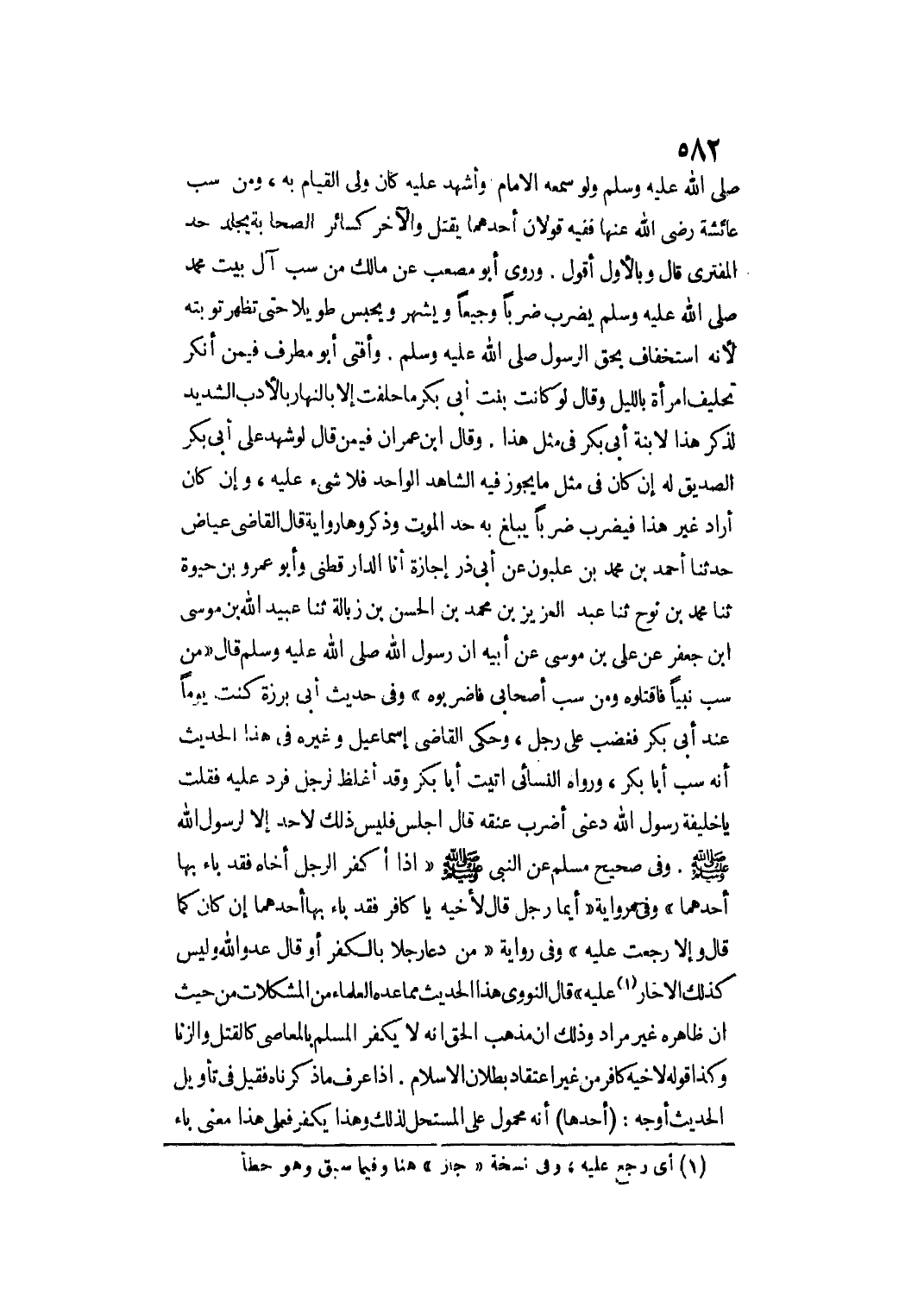 قَالَ الْقَاضِي عِيَاضٌ: حَدَّثَنَا أَحْمَدُ بْنُ مُحَمَّدِ بْنِ عَلْبُونٍ عَنْ أَبِي ذَرٍّ إجَازَةً. أَنَا الدَّارَقُطْنِيُّ وَأَبُو عَمْرِو بْنُ حَيْوَةَ ثنا مُحَمَّدُ بْنُ نُوحٍ ثنا عَبْدُ الْعَزِيزِ بْنُ مُحَمَّدِ بْنِ الْحَسَنِ بْنِ زَبَالَةَ ثنا عُبَيْدُ اللَّهِ بْنُ مُوسَى بْنِ جَعْفَرٍ عَنْ عَلِيِّ بْنِ مُوسَى عَنْ أَبِيهِ أَنَّ رَسُولَ اللَّهِ - صَلَّى اللَّهُ عَلَيْهِ وَسَلَّمَ - قَالَ «مَنْ سَبَّ نَبِيًّا فَاقْتُلُوهُ وَمَنْ سَبَّ أَصْحَابِي فَاضْرِبُوهُ»