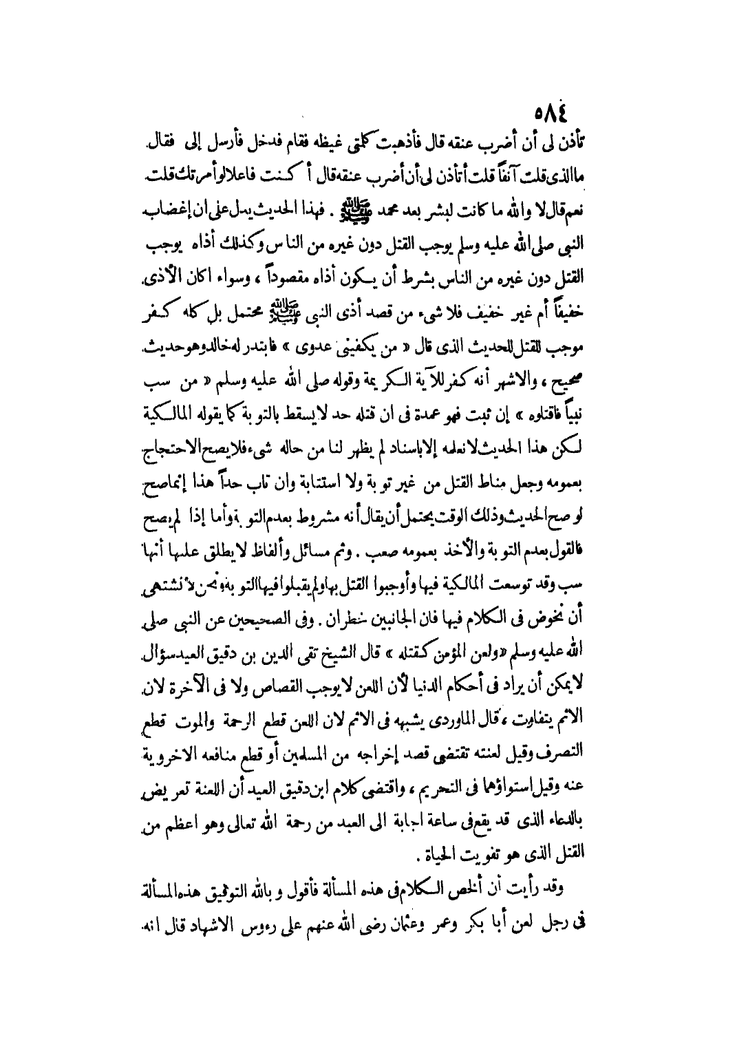 فَهَذَا الْحَدِيثُ يَدُلُّ عَلَى أَنَّ إغْضَابَ النَّبِيِّ - صَلَّى اللَّهُ عَلَيْهِ وَسَلَّمَ - يُوجِبُ الْقَتْلَ دُونَ غَيْرِهِ مِنْ النَّاسِ، وَكَذَلِكَ أَذَاهُ يُوجِبُ الْقَتْلَ دُونَ غَيْرِهِ مِنْ النَّاسِ بِشَرْطِ أَنْ يَكُونَ أَذَاهُ مَقْصُودًا، وَسَوَاءٌ أَكَانَ الْأَذَى خَفِيفًا أَمْ غَيْرَ خَفِيفٍ فَلَا شَيْءَ مِنْ قَصْدِ أَذَى النَّبِيِّ - صَلَّى اللَّهُ عَلَيْهِ وَسَلَّمَ - مُحْتَمَلٌ بَلْ كُلُّهُ كُفْرٌ مُوجِبٌ لِلْقَتْلِ؛ لِلْحَدِيثِ الَّذِي قَالَ «مَنْ يَكْفِينِي عَدُوِّي» فَابْتَدَرَ لَهُ خَالِدٌ وَهُوَ حَدِيثٌ صَحِيحٌ وَالْأَشْهَرُ أَنَّهُ كُفْرٌ لِلْآيَةِ الْكَرِيمَةِ، وَقَوْلُهُ - صَلَّى اللَّهُ عَلَيْهِ وَسَلَّمَ - «مَنْ سَبَّ نَبِيًّا فَاقْتُلُوهُ» إنْ ثَبَتَ فَهُوَ عُمْدَةٌ فِي أَنَّ قَتْلَهُ حَدٌّ لَا يَسْقُطُ بِالتَّوْبَةِ كَمَا يَقُولُهُ الْمَالِكِيَّةُ لَكِنَّ هَذَا الْحَدِيثَ لَا نَعْلَمُهُ إلَّا بِإِسْنَادٍ لَمْ يَظْهَرْ لَنَا مِنْ حَالِهِ شَيْءٌ فَلَا يَصِحُّ الِاحْتِجَاجُ بِعُمُومِهِ وَجَعْلُ مَنَاطِ الْقَتْلِ مِنْ غَيْرِ تَوْبَةٍ وَلَا اسْتِتَابَةٍ، وَإِنْ تَابَ حَدًّا هَذَا إنَّمَا صَحَّ لَوْ صَحَّ الْحَدِيثُ وَذَلِكَ الْوَقْتُ يَحْتَمِلُ أَنْ يُقَالَ: إنَّهُ مَشْرُوطٌ بِعَدَمِ التَّوْبَةِ وَأَمَّا إذَا لَمْ يَصِحَّ فَالْقَوْلُ بِعَدَمِ التَّوْبَةِ وَالْأَخْذِ بِعُمُومِهِ صَعْبٌ.