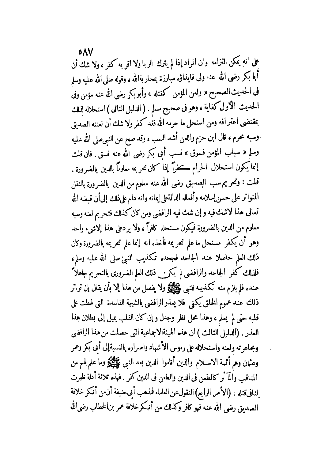 (الْأَمْرُ الرَّابِعُ) النُّقُولُ عَنْ الْعُلَمَاءِ فَمَذْهَبُ أَبِي حَنِيفَةَ أَنَّ مَنْ أَنْكَرَ خِلَافَةَ الصِّدِّيقِ - رَضِيَ اللَّهُ عَنْهُ - فَهُوَ كَافِرٌ وَكَذَلِكَ مَنْ أَنْكَرَ خِلَافَةَ عُمَرَ بْنِ الْخَطَّابِ - رَضِيَ اللَّهُ عَنْهُ -