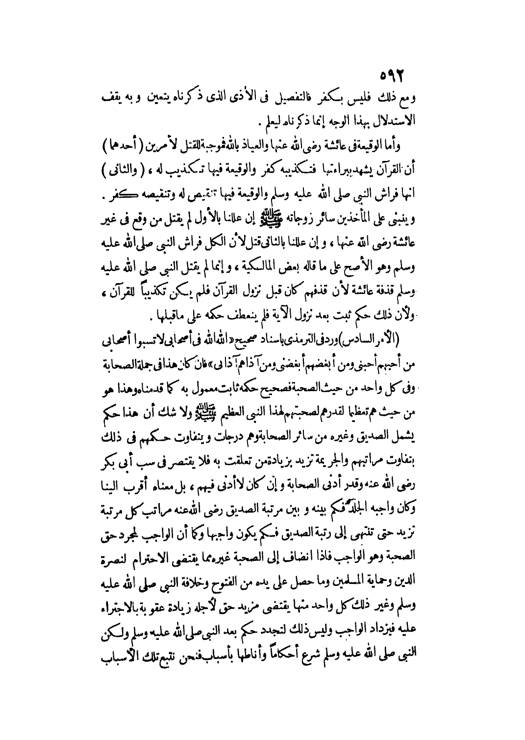 (الْأَمْرُ السَّادِسُ) وَرَدَ فِي التِّرْمِذِيِّ بِإِسْنَادٍ صَحِيحٍ «اللَّهَ اللَّهَ فِي أَصْحَابِي لَا تَسُبُّوا أَصْحَابِي مَنْ أَحَبَّهُمْ أَحَبَّنِي وَمَنْ أَبْغَضَهُمْ أَبْغَضَنِي وَمَنْ آذَاهُمْ آذَانِي» فَإِنْ كَانَ هَذَا فِي جُمْلَةِ الصَّحَابَةِ وَفِي كُلِّ وَاحِدٍ مِنْ حَيْثُ الصُّحْبَةُ فَصَحِيحُ حُكْمِهِ ثَابِتٌ مَعْمُولٌ بِهِ كَمَا قَدَّمْنَاهُ وَهَذَا هُوَ مِنْ حَيْثُ هُمْ تَعْظِيمًا لِقَدْرِهِمْ لِصُحْبَتِهِمْ لِهَذَا النَّبِيِّ الْعَظِيمِ - صَلَّى اللَّهُ عَلَيْهِ وَسَلَّمَ - وَلَا شَكَّ أَنَّ هَذَا حُكْمٌ يَشْمَلُ الصِّدِّيقَ وَغَيْرَهُ مِنْ سَائِرِ الصَّحَابَةِ وَهُمْ دَرَجَاتٌ وَيَتَفَاوَتُ حُكْمُهُمْ فِي ذَلِكَ بِتَفَاوُتِ مَرَاتِبِهِمْ وَالْجَرِيمَةُ تَزِيدُ بِزِيَادَةِ مَنْ تَعَلَّقَتْ بِهِ فَلَا يُقْتَصَرُ فِي سَبِّ أَبِي بَكْرٍ - رَضِيَ اللَّهُ عَنْهُ - وَقَدْرِ أَدْنَى الصَّحَابَةِ وَإِنْ كَانَ لَا أَدْنَى فِيهِمْ، بَلْ مَعْنَاهُ أَقْرَبُ إلَيْنَا وَكَانَ وَاجِبُهُ الْجَلْدَ فَكَمْ بَيْنَهُ وَبَيْنَ مَرْتَبَةِ الصِّدِّيقِ - رَضِيَ اللَّهُ عَنْهُ - مَرَاتِبُ كُلُّ مَرْتَبَةٍ تَزِيدُ حَتَّى تَنْتَهِيَ إلَى رُتْبَةِ الصِّدِّيقِ فَكَمْ يَكُونُ وَاجِبُهَا وَكَمَا أَنَّ الْوَاجِبَ لِمُجَرَّدِ حَقِّ الصُّحْبَةِ وَهُوَ الْوَاجِبُ فَإِذَا انْضَافَ إلَى الصُّحْبَةِ غَيْرُهُ مِمَّا يَقْتَضِي الِاحْتِرَامَ لِنُصْرَةِ الدِّينِ وَحِمَايَةِ الْمُسْلِمِينَ.