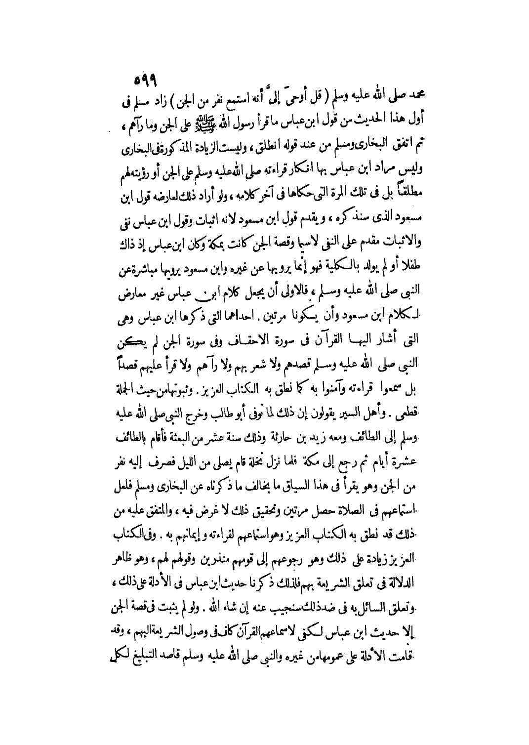 وَلَيْسَ مُرَادُ ابْنِ عَبَّاسٍ بِهَا إنْكَارَ قِرَاءَتِهِ - صَلَّى اللَّهُ عَلَيْهِ وَسَلَّمَ - عَلَى الْجِنِّ أَوْ رُؤْيَتِهِ لَهُمْ مُطْلَقًا بَلْ فِي تِلْكَ الْمَرَّةِ الَّتِي حَكَاهَا فِي آخِرِ كَلَامِهِ، وَلَوْ أَرَادَ ذَلِكَ لَعَارَضَهُ قَوْلُ ابْنِ مَسْعُودٍ الَّذِي سَنَذْكُرُهُ، وَيُقَدَّمُ قَوْلُ ابْنِ مَسْعُودٍ؛ لِأَنَّهُ إثْبَاتٌ. وَقَوْلُ ابْنِ عَبَّاسٍ نَفْيٌ وَالْإِثْبَاتُ مُقَدَّمٌ عَلَى النَّفْيِ لَا سِيَّمَا وَقِصَّةُ الْجِنِّ كَانَتْ بِمَكَّةَ وَكَانَ ابْنُ عَبَّاسٍ إذْ ذَاكَ طِفْلًا أَوْ لَمْ يُولَدْ بِالْكُلِّيَّةِ فَهُوَ إنَّمَا يَرْوِيهَا عَنْ غَيْرِهِ وَابْنِ مَسْعُودٍ يَرْوِيهَا مُبَاشَرَةً عَنْ النَّبِيِّ - صَلَّى اللَّهُ عَلَيْهِ وَسَلَّمَ - فَالْأَوْلَى أَنْ يُجْعَلَ كَلَامُ ابْنِ عَبَّاسٍ غَيْرَ مُعَارِضٍ لِكَلَامِ ابْنِ مَسْعُودٍ وَأَنْ يَكُونَا مَرَّتَيْنِ.