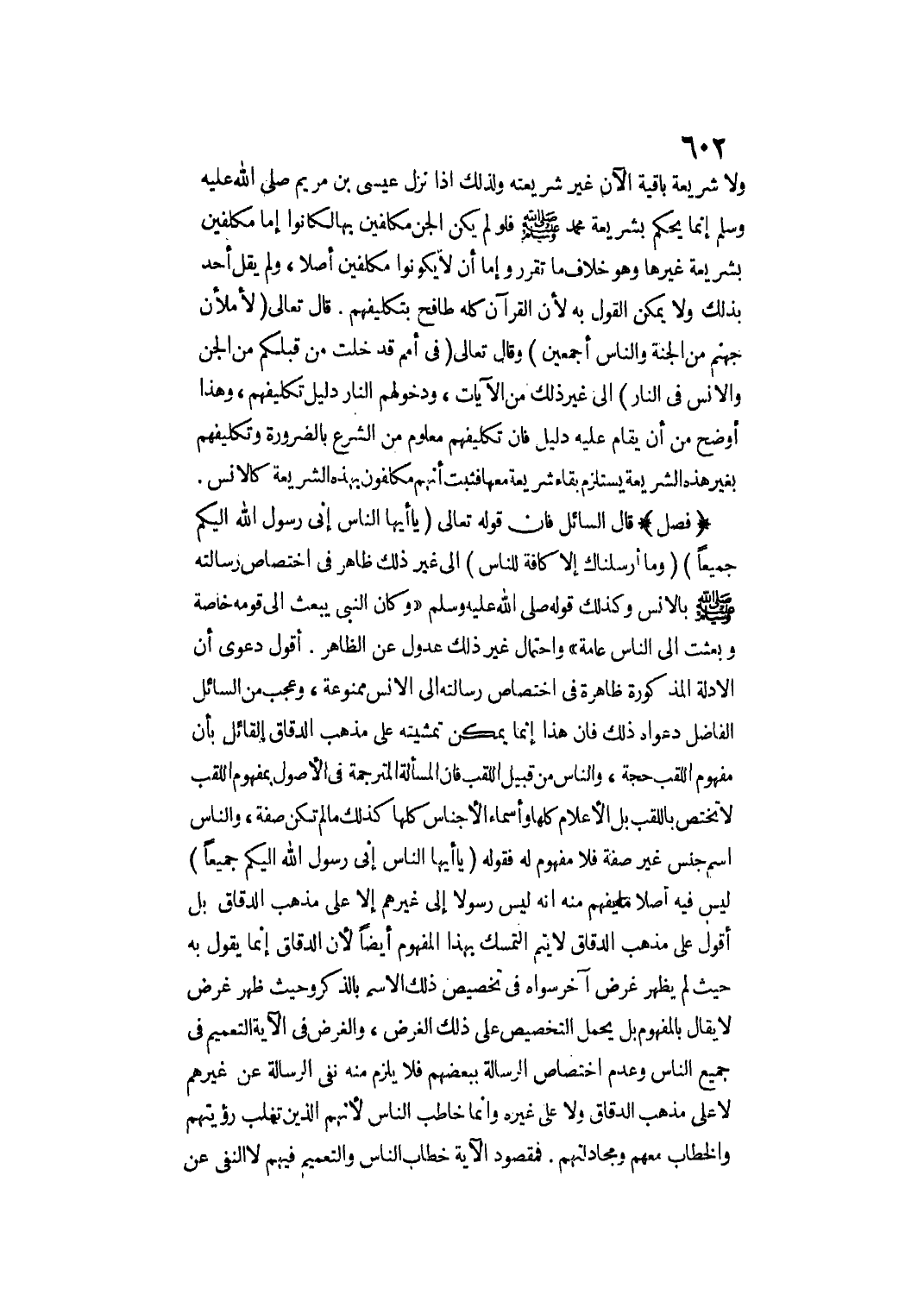 (فَصْلٌ) قَالَ السَّائِلُ: فَإِنَّ قَوْله تَعَالَى {يَا أَيُّهَا النَّاسُ إِنِّي رَسُولُ اللَّهِ إِلَيْكُمْ جَمِيعًا} [الأعراف: 158] {وَمَا أَرْسَلْنَاكَ إِلا كَافَّةً لِلنَّاسِ} [سبأ: 28] إلَى غَيْرِ ذَلِكَ ظَاهِرٌ فِي اخْتِصَاصِ رِسَالَتِهِ - صَلَّى اللَّهُ عَلَيْهِ وَسَلَّمَ - بِالْإِنْسِ وَكَذَلِكَ قَوْلُهُ - صَلَّى اللَّهُ عَلَيْهِ وَسَلَّمَ - «وَكَانَ النَّبِيُّ يُبْعَثُ إلَى قَوْمِهِ خَاصَّةً وَبُعِثْت إلَى النَّاسِ عَامَّةً» وَاحْتِمَالُ غَيْرِ ذَلِكَ عُدُولٌ عَنْ الظَّاهِرِ.