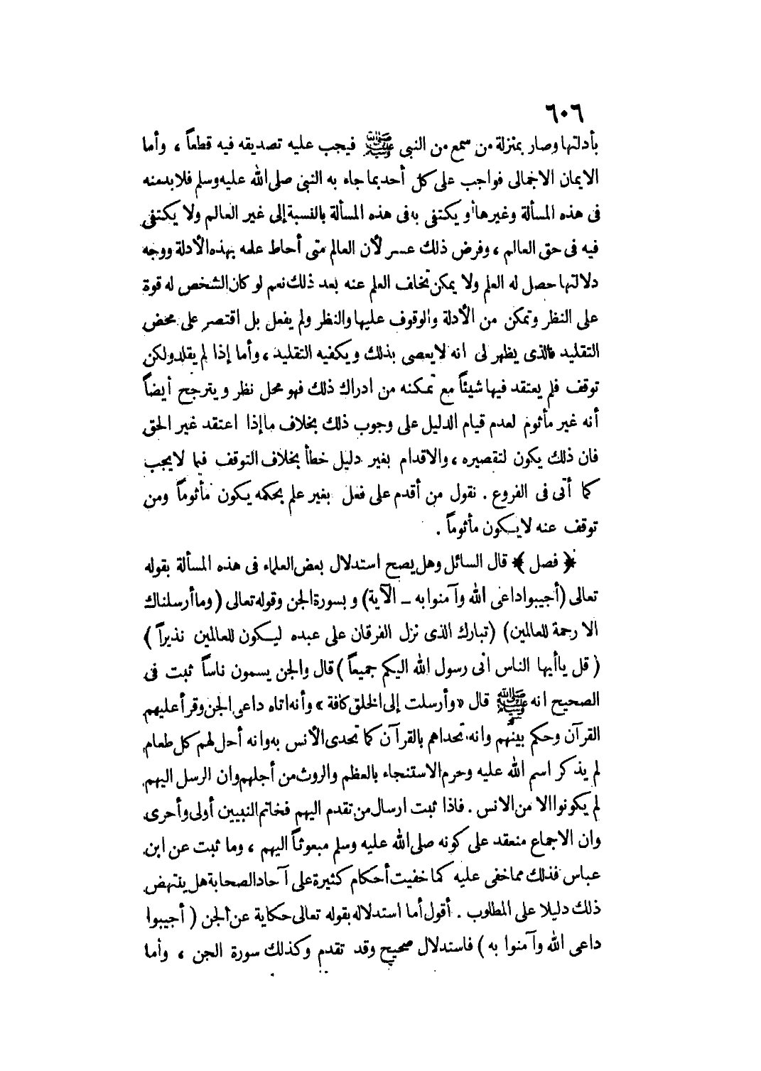 بِأَدِلَّتِهَا وَصَارَ بِمَنْزِلَةِ مَنْ سَمِعَ مِنْ النَّبِيِّ - صَلَّى اللَّهُ عَلَيْهِ وَسَلَّمَ - فَيَجِبُ عَلَيْهِ تَصْدِيقُهُ فِيهِ قَطْعًا، وَأَمَّا الْإِيمَانُ الْإِجْمَالِيُّ فَوَاجِبٌ عَلَى كُلِّ أَحَدٍ بِمَا جَاءَ بِهِ النَّبِيُّ - صَلَّى اللَّهُ عَلَيْهِ وَسَلَّمَ - فَلَا بُدَّ مِنْهُ فِي هَذِهِ الْمَسْأَلَةِ وَغَيْرِهَا أَوْ يُكْتَفَى بِهِ فِي هَذِهِ الْمَسْأَلَةِ بِالنِّسْبَةِ إلَى غَيْرِ الْعَالِمِ وَلَا يُكْتَفَى فِيهِ فِي حَقِّ الْعَالِمِ، وَفَرْضُ ذَلِكَ عُسْرٌ؛ لِأَنَّ الْعَالِمَ مَتَى أَحَاطَ عِلْمُهُ بِهَذِهِ الْأَدِلَّةِ وَوَجْهِ دَلَالَتِهَا حَصَلَ لَهُ الْعِلْمُ وَلَا يُمْكِنُ تَخَلُّفُ الْعِلْمِ عَنْهُ بَعْدَ ذَلِكَ نَعَمْ لَوْ كَانَ الشَّخْصُ لَهُ قُوَّةٌ عَلَى النَّظَرِ وَتَمَكُّنٌ مِنْ الْأَدِلَّةِ وَالْوُقُوفِ عَلَيْهَا وَالنَّظَرِ وَلَمْ يَفْعَلْ بَلْ اقْتَصَرَ عَلَى مَحْضِ التَّقْلِيدِ فَاَلَّذِي يَظْهَرُ لِي أَنَّهُ لَا يَعْصِي بِذَلِكَ وَيَكْفِيهِ التَّقْلِيدُ، وَأَمَّا إذَا لَمْ يُقَلِّدْ وَلَكِنْ تَوَقَّفَ فَلَمْ يَعْتَقِدْ فِيهَا شَيْئًا مَعَ تَمَكُّنِهِ مِنْ إدْرَاكِ ذَلِكَ فَهُوَ مَحَلُّ نَظَرٍ وَيَتَرَجَّحُ أَيْضًا أَنَّهُ غَيْرُ مَأْثُومٍ لِعَدَمِ قِيَامِ الدَّلِيلِ عَلَى وُجُوبِ ذَلِكَ بِخِلَافِ مَا إذَا اعْتَقَدَ غَيْرَ الْحَقِّ فَإِنَّ ذَلِكَ يَكُونُ لِتَقْصِيرِهِ، وَالْإِقْدَامُ بِغَيْرِ دَلِيلٍ خَطَأٌ بِخِلَافِ التَّوَقُّفِ فِيمَا لَا يَجِبُ كَمَا أَتَى فِي الْفُرُوعِ.