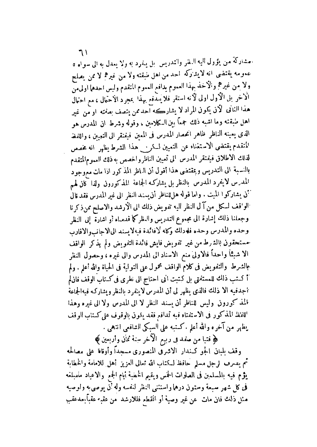 مُشَارَكَةُ مَنْ يَئُولُ إلَيْهِ النَّظَرُ وَالتَّدْرِيسُ بَلْ يَنْفَرِدُ بِهِ وَلَا يُعْدَلُ بِهِ إلَى سِوَاهُ " عُمُومُهُ يَقْتَضِي أَنَّهُ لَا يُشَارِكُهُ أَحَدٌ مِنْ أَهْلِ طَبَقَتِهِ وَلَا مِنْ غَيْرِهِمْ لَا مِمَّنْ يَصْلُحُ وَلَا مِنْ غَيْرِهِمْ وَالْأَخْذُ بِهَذَا الْعُمُومِ يُدَافِعُ الْعُمُومَ الْمُتَقَدِّمَ وَلَيْسَ أَحَدُهُمَا أَوْلَى مِنْ الْآخَرِ بَلْ الْأَوَّلُ أَوْلَى؛ لِأَنَّهُ اسْتَقَرَّ فَلَا يَنْدَفِعُ بِهَذَا بِمُجَرَّدِ الِاحْتِمَالِ، مَعَ احْتِمَالِ هَذَا الثَّانِي لَأَنْ يَكُونَ الْمُرَادُ لَا يُشَارِكُهُ أَحَدٌ مِمَّنْ يَتَّصِفُ بِصِفَتِهِ أَوْ مِنْ غَيْرِ أَهْلِ طَبَقَتِهِ وَمَا أَشْبَهَ ذَلِكَ جَمْعًا بَيْنَ الْكَلَامَيْنِ، وَقَوْلُهُ وَشَرْطُ أَنَّ الْمُدَرِّسَ هُوَ الَّذِي يُعَيِّنُهُ النَّاظِرُ ظَاهِرٌ انْحِصَارُ الْمُدَرِّسِ فِي الْمُعَيَّنِ فَيَفْتَقِرُ إلَى التَّعْيِينِ، وَاللَّفْظُ الْمُتَقَدِّمُ يَقْتَضِي الِاسْتِغْنَاءَ عَنْ التَّعْيِينِ لَكِنْ هَذَا الشَّرْطُ يَظْهَرُ أَنَّهُ مُخَصِّصٌ لِذَلِكَ الْإِطْلَاقِ فَيَفْتَقِرُ الْمُدَرِّسُ إلَى تَعْيِينِ النَّاظِرِ وَخُصِّصَ بِهِ ذَلِكَ الْعُمُومُ الْمُتَقَدِّمُ بِالنِّسْبَةِ إلَى التَّدْرِيسِ وَبِمُقْتَضَى هَذَا أَقُولُ إنَّ النَّاظِرَ الْمَذْكُورَ إذَا مَاتَ مَعَ وُجُودِ الْمُدَرِّسِ لَا يُفْرَدُ الْمُدَرِّسُ بِالنَّظَرِ بَلْ يُشَارِكُهُ الْجَمَاعَةُ الْمَذْكُورُونَ وَلِذَا كَانَ لَهُمْ أَنْ يُشَارِكُوا الْمَيِّتَ.