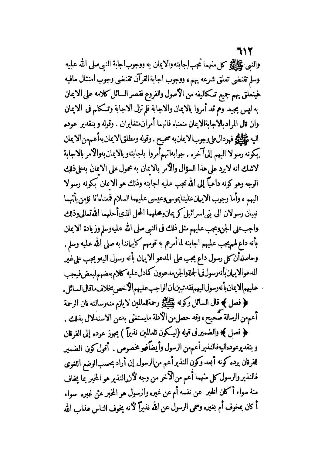 (فَصْلٌ) وَالضَّمِيرُ فِي قَوْلِهِ {لِيَكُونَ لِلْعَالَمِينَ نَذِيرًا} [الفرقان: 1] يَجُوزُ عَوْدُهُ إلَى الْفُرْقَانِ وَبِتَقْدِيرِ عَوْدِهِ إلَيْهِ فَالنَّذِيرُ أَعَمُّ مِنْ الرَّسُولِ وَأَيْضًا فَهُوَ مَخْصُوصٌ.