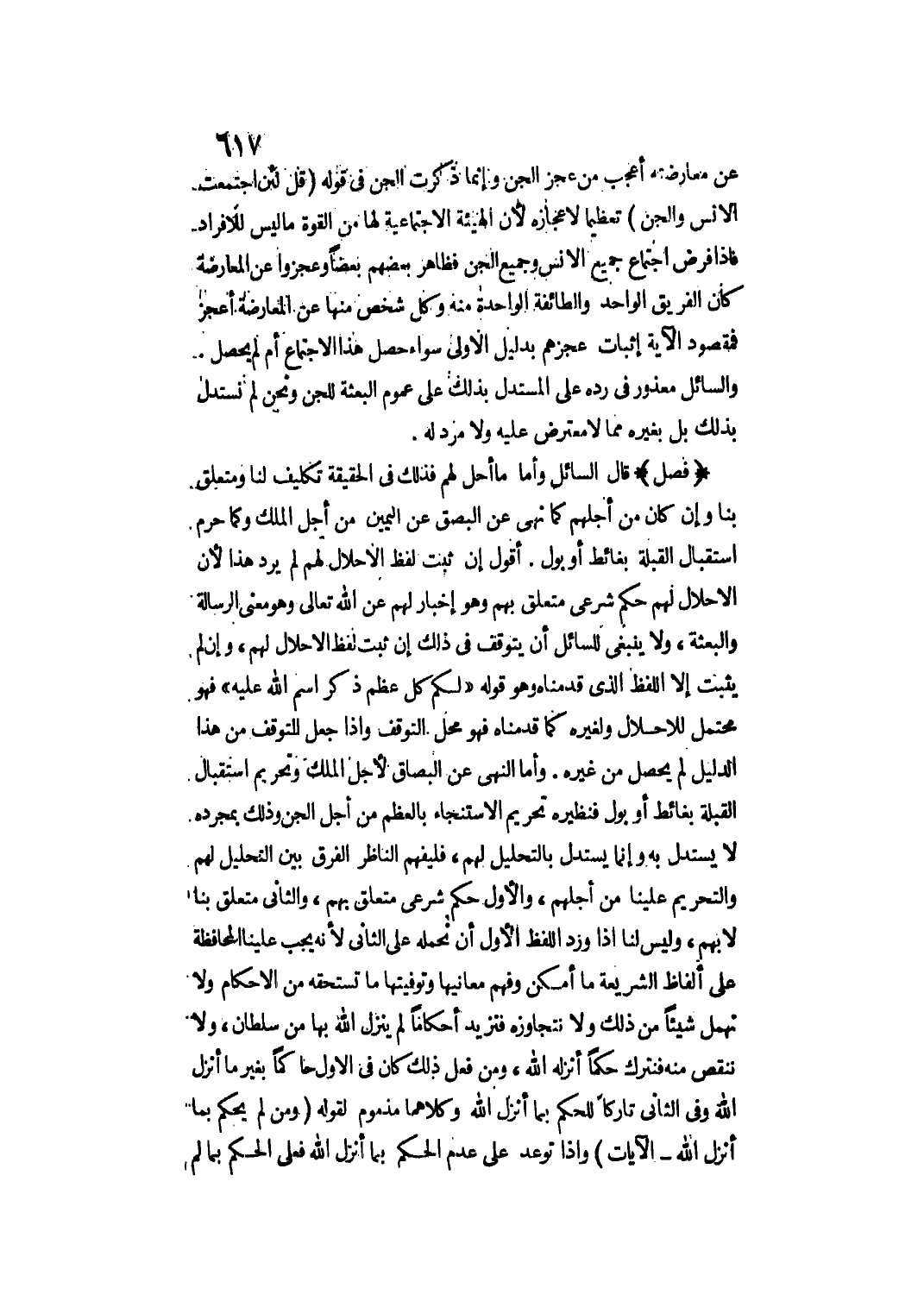 وَأَمَّا النَّهْيُ عَنْ الْبُصَاقِ لِأَجْلِ الْمَلَكِ وَتَحْرِيمُ اسْتِقْبَالِ الْقِبْلَةِ بِغَائِطٍ أَوْ بَوْلٍ فَنَظِيرُهُ تَحْرِيمُ الِاسْتِنْجَاءِ بِالْعَظْمِ مِنْ أَجْلِ الْجِنِّ وَذَلِكَ بِمُجَرَّدِهِ لَا يُسْتَدَلُّ بِهِ وَإِنَّمَا يُسْتَدَلُّ بِالتَّحْلِيلِ لَهُمْ، فَلْيَفْهَمْ النَّاظِرُ الْفَرْقَ بَيْنَ التَّحْلِيلِ لَهُمْ وَالتَّحْرِيمِ عَلَيْنَا مِنْ أَجْلِهِمْ، وَالْأَوَّلُ حُكْمٌ شَرْعِيٌّ مُتَعَلِّقٌ بِهِمْ، وَالثَّانِي مُتَعَلِّقٌ بِنَا لَا بِهِمْ، وَلَيْسَ لَنَا إذَا وَرَدَ اللَّفْظُ الْأَوَّلُ أَنْ نَحْمِلَهُ عَلَى الثَّانِي؛ لِأَنَّهُ يَجِبُ عَلَيْنَا الْمُحَافَظَةُ عَلَى أَلْفَاظِ الشَّرِيعَةِ مَا أَمْكَنَ وَفَهْمُ مَعَانِيهَا وَتَوْفِيَتُهَا مَا تَسْتَحِقُّهُ مِنْ الْأَحْكَامِ وَلَا نُهْمِلُ شَيْئًا مِنْ ذَلِكَ وَلَا نَتَجَاوَزُهُ فَنَزِيدُ أَحْكَامًا لَمْ يُنْزِلْ اللَّهُ بِهَا مِنْ سُلْطَانٍ، وَلَا نَنْقُصُ مِنْهُ فَنَتْرُكُ حُكْمًا أَنْزَلَهُ اللَّهُ، مَنْ فَعَلَ ذَلِكَ كَانَ فِي الْأَوَّلِ حَاكِمًا بِغَيْرِ مَا أَنْزَلَ اللَّهُ، وَفِي الثَّانِي تَارِكًا لِلْحُكْمِ بِمَا أَنْزَلَ اللَّهُ وَكِلَاهُمَا مَذْمُومٌ لِقَوْلِهِ {وَمَنْ لَمْ يَحْكُمْ بِمَا أَنْزَلَ اللَّهُ} [المائدة: 44]- الْآيَاتِ وَإِذَا تَوَعَّدَ عَلَى عَدَمِ الْحُكْمِ بِمَا أَنْزَلَ اللَّهُ فَعَلَى الْحُكْمِ بِمَا لَمْ