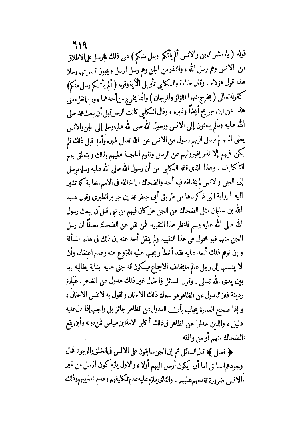 وَهَذَا الَّذِي قَالَهُ الْكَلْبِيُّ مِنْ أَنَّ رَسُولَ اللَّهِ - صَلَّى اللَّهُ عَلَيْهِ وَسَلَّمَ - مُرْسَلٌ إلَى الْجِنِّ وَالْإِنْسِ لَمْ يُخَالِفْهُ فِيهِ أَحَدٌ وَالضَّحَّاكُ إنَّمَا خَالَفَهُ فِي الْأُمَمِ الْخَالِيَةِ كَمَا تُشِيرُ إلَيْهِ الرِّوَايَةُ الَّتِي ذَكَرْنَاهَا مِنْ طَرِيقِ أَبِي جَعْفَرٍ مُحَمَّدِ بْنِ جَرِيرٍ الطَّبَرِيِّ، وَقَوْلُ عُبَيْدِ اللَّهِ بْنِ سُلَيْمَانَ مِثْلُ الضَّحَّاكِ عَنْ الْجِنِّ هَلْ كَانَ فِيهِمْ مِنْ نَبِيٍّ قَبْلَ أَنْ يُبْعَثَ رَسُولُ اللَّهِ - صَلَّى اللَّهُ عَلَيْهِ وَسَلَّمَ - فَانْظُرْ هَذَا التَّقْيِيدَ فَمَنْ نَقَلَ عَنْ الضَّحَّاكِ مُطْلَقًا أَنَّ رُسُلَ الْجِنِّ مِنْهُمْ فَهُوَ مَحْمُولٌ عَلَى هَذَا التَّقْيِيدِ وَلَمْ يَنْقُلْ أَحَدٌ عَنْهُ أَنَّ ذَلِكَ فِي هَذِهِ الْمَسْأَلَةِ وَإِنْ تَوَهَّمَ ذَلِكَ أَحَدٌ عَلَيْهِ فَقَدْ أَخْطَأَ وَيَجِبُ عَلَيْهِ النُّزُوعُ عَنْهُ وَعَدَمُ اعْتِقَادِهِ، وَأَنْ لَا يَنْسِبَ إلَى رَجُلٍ عَالِمٍ مَا يُخَالِفُ الْإِجْمَاعَ فَيَكُونُ قَدْ جَنَى عَلَيْهِ جِنَايَةً يُطَالِبُهُ بِهَا بَيْنَ يَدَيْ اللَّهِ تَعَالَى.