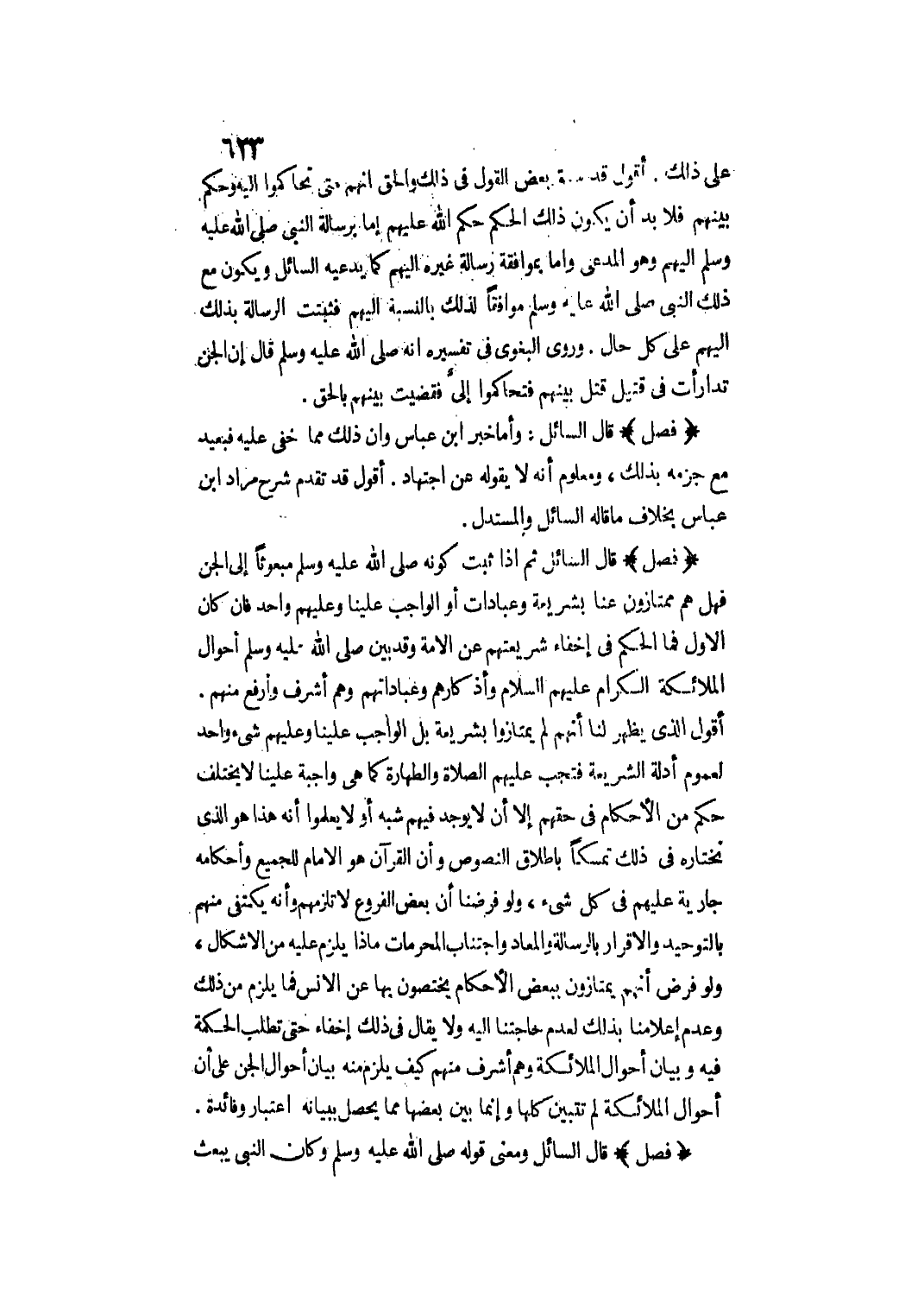 وَلَوْ فَرَضْنَا أَنَّ بَعْضَ الْفُرُوعِ لَا تَلْزَمُهُمْ وَأَنَّهُ يُكْتَفَى مِنْهُمْ بِالتَّوْحِيدِ وَالْإِقْرَارِ بِالرِّسَالَةِ وَالْمَعَادِ وَاجْتِنَابِ الْمُحَرَّمَاتِ مَاذَا يَلْزَمُ عَلَيْهِ مِنْ الْأَشْكَالِ، وَلَوْ فُرِضَ أَنَّهُمْ يَمْتَازُونَ بِبَعْضِ الْأَحْكَامِ يُخْتَصُّونَ بِهَا عَنْ الْإِنْسِ فَمَا يَلْزَمُ مِنْ ذَلِكَ وَعَدَمُ إعْلَامِنَا بِذَلِكَ لِعَدَمِ حَاجَتِنَا إلَيْهِ وَلَا يُقَالُ فِي ذَلِكَ إخْفَاءٌ حَتَّى تَطْلُبَ لِحِكْمَةٍ فِيهِ وَبَيَانُ أَحْوَالِ الْمَلَائِكَةِ وَهُمْ أَشْرَفُ مِنْهُمْ كَيْفَ يَلْزَمُ مِنْهُ بَيَانُ أَحْوَالِ الْجِنِّ عَلَى أَنَّ أَحْوَالَ الْمَلَائِكَةِ لَمْ تَتَبَيَّنْ كُلُّهَا وَإِنَّمَا بُيِّنَ بَعْضُهَا مِمَّا يَحْصُلُ بِبَيَانِهِ اعْتِبَارٌ وَفَائِدَةٌ.