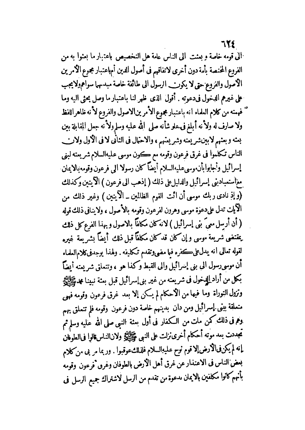 وَلِهَذَا يُوجَدُ فِي كَلَامِ الْعُلَمَاءِ أَنَّ مُوسَى رَسُولٌ إلَى بَنِي إسْرَائِيلَ وَإِلَى الْقِبْطِ وَكَذَا هُوَ، وَتَتَعَلَّقُ شَرِيعَتُهُ أَيْضًا بِكُلِّ مَنْ أَرَادَ الدُّخُولَ فِي شَرِيعَتِهِ مِنْ غَيْرِ بَنِي إسْرَائِيلَ قَبْلَ بَعْثَةِ نَبِيِّنَا مُحَمَّدٍ - صَلَّى اللَّهُ عَلَيْهِ وَسَلَّمَ - وَنُزُولِ التَّوْرَاةِ وَمَا فِيهَا مِنْ الْأَحْكَامِ لَمْ يَكُنْ إلَّا بَعْدَ غَرَقِ فِرْعَوْنَ وَقَوْمِهِ فَهِيَ مُتَعَلِّقَةٌ بِبَنِي إسْرَائِيلَ وَمِنْ دَانَ بِدِينِهِمْ خَاصَّةً دُونَ فِرْعَوْنَ وَقَوْمِهِ فَلَمْ تَتَعَلَّقْ بِهِمْ وَهُمْ فِي ذَلِكَ كَمَنْ مَاتَ مِنْ الْكُفَّارِ فِي أَوَّلِ بَعْثَةِ النَّبِيِّ - صَلَّى اللَّهُ عَلَيْهِ وَسَلَّمَ - ثُمَّ تَجَدَّدَتْ بَعْدَ مَوْتِهِ أَحْكَامٌ أُخْرَى نَزَلَتْ عَلَى النَّبِيِّ - صَلَّى اللَّهُ عَلَيْهِ وَسَلَّمَ - وَلِأَنَّ النَّاسَ قَالُوا فِي الطُّوفَانِ: إنَّهُ لَمْ يَكُنْ فِي الْأَرْضِ إلَّا قَوْمُ نُوحٍ - عَلَيْهِ السَّلَامُ - فَلِذَلِكَ عُوقِبُوا.