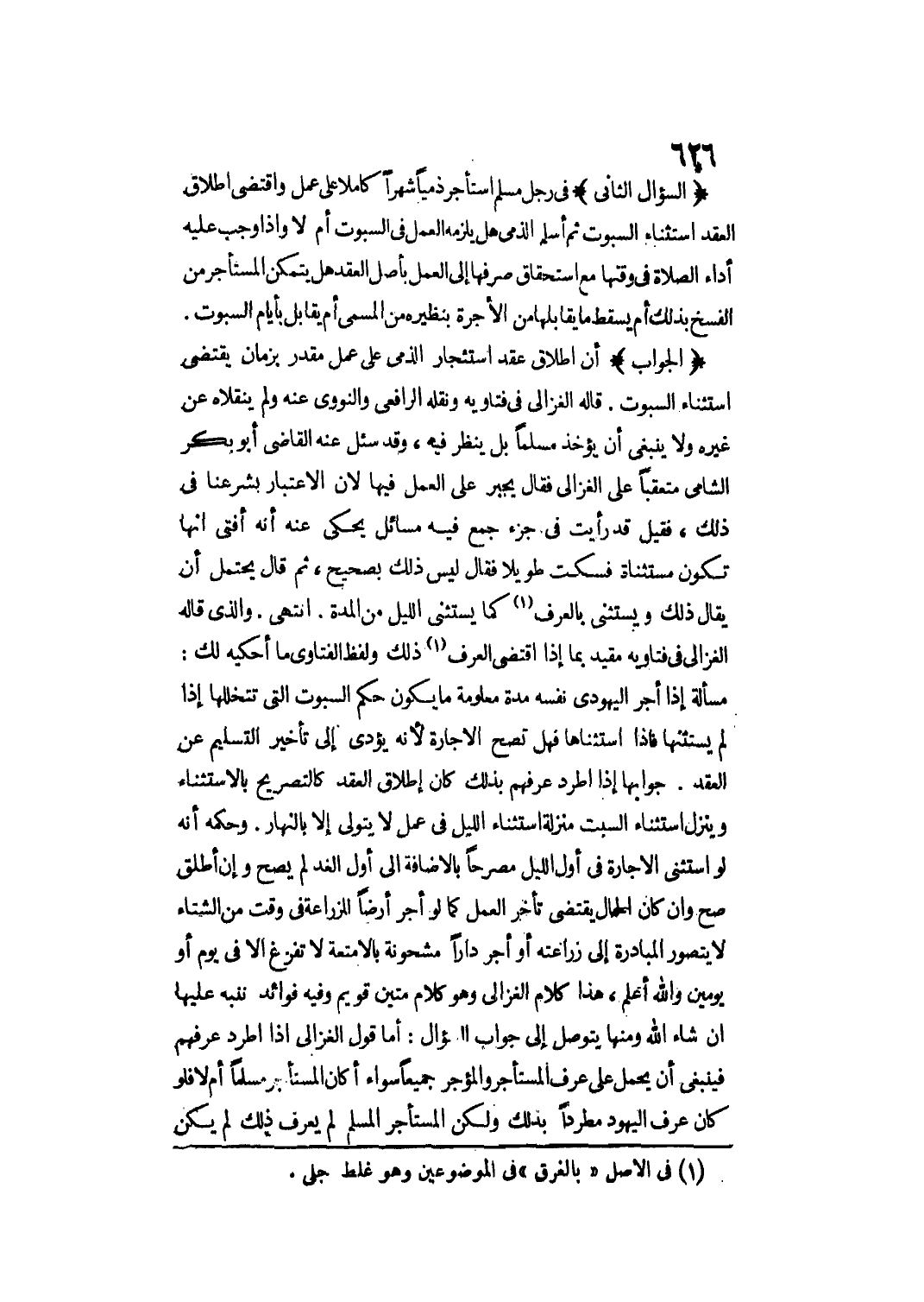وَاَلَّذِي قَالَهُ الْغَزَالِيُّ فِي فَتَاوِيهِ مُقَيَّدٌ بِمَا إذَا اقْتَضَى الْعُرْفُ ذَلِكَ وَلَفْظُ الْفَتَاوَى مَا أَحْكِيهِ لَك: مَسْأَلَةٌ إذَا أَجَّرَ الْيَهُودِيُّ نَفْسَهُ مُدَّةً مَعْلُومَةً مَا يَكُونُ حُكْمُ السُّبُوتِ الَّتِي تَتَخَلَّلُهَا إذَا لَمْ يَسْتَثْنِهَا فَإِذَا اسْتَثْنَاهَا فَهَلْ تَصِحُّ الْإِجَارَةُ؛ لِأَنَّهُ يُؤَدِّي إلَى تَأْخِيرِ التَّسْلِيمِ عَنْ الْعَقْدِ.