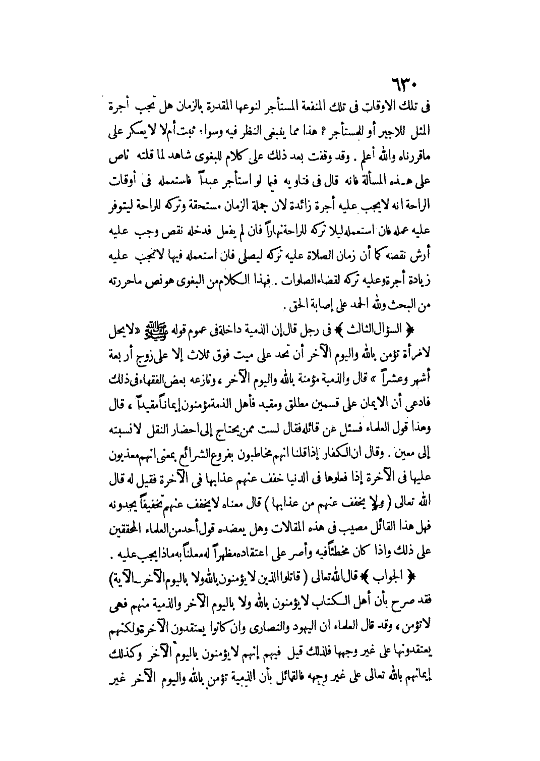 (الْجَوَابُ) قَالَ اللَّهُ تَعَالَى {قَاتِلُوا الَّذِينَ لا يُؤْمِنُونَ بِاللَّهِ وَلا بِالْيَوْمِ الآخِرِ} [التوبة: 29]- الْآيَةَ فَقَدْ صَرَّحَ بِأَنَّ أَهْلَ الْكِتَابِ لَا يُؤْمِنُونَ بِاَللَّهِ وَلَا بِالْيَوْمِ الْآخِرِ وَالذِّمِّيَّةُ مِنْهُمْ فَهِيَ لَا تُؤْمِنُ، وَقَدْ قَالَ الْعُلَمَاءُ: إنَّ الْيَهُودَ وَالنَّصَارَى وَإِنْ كَانُوا يَعْتَقِدُونَ الْآخِرَةَ وَلَكِنَّهُمْ يَعْتَقِدُونَهَا عَلَى غَيْرِ وَجْهِهَا فَلِذَلِكَ قِيلَ فِيهِمْ: إنَّهُمْ لَا يُؤْمِنُونَ بِالْيَوْمِ الْآخِرِ وَكَذَلِكَ إيمَانُهُمْ بِاَللَّهِ تَعَالَى عَلَى غَيْرِ وَجْهِهِ فَالْقَائِلُ بِأَنَّ الذِّمِّيَّةَ تُؤْمِنُ بِاَللَّهِ وَالْيَوْمِ الْآخِرِ غَيْرُ