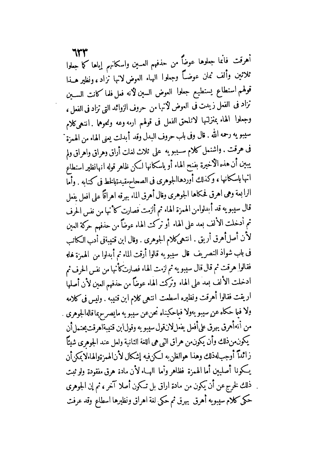 وَقَالَ ابْنُ قُتَيْبَةَ فِي أَدَبِ الْكَاتِبِ فِي بَابِ شَوَاذِّ التَّصْرِيفِ قَالَ سِيبَوَيْهِ: قَالُوا: الْمَاءُ ثُمَّ أَبْدَلُوا مِنْ الْهَمْزَةِ هَاءً فَقَالُوا: هَرَقْت، ثُمَّ قَالَ سِيبَوَيْهِ: ثُمَّ لَزِمَتْ الْهَاءَ فَصَارَتْ كَأَنَّهَا مِنْ نَفْسِ الْحَرْفِ ثُمَّ أُدْخِلَتْ الْأَلْفُ بَعْدُ عَلَى الْهَاءِ وَتُرِكَتْ الْهَاءُ عِوَضًا مِنْ حَذْفِهِمْ الْعَيْنَ؛ لِأَنَّ أَصْلَهَا أُرِيقَتْ فَقَالُوا: أُهْرِقَتْ وَنَظِيرُهُ اسْطَعْتَ. انْتَهَى كَلَامُ ابْنِ قُتَيْبَةَ.