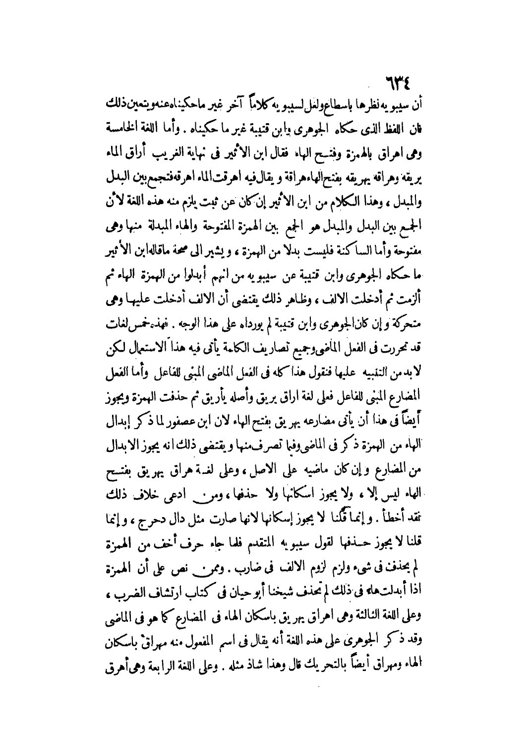 وَمِمَّنْ نَصَّ عَلَى أَنَّ الْهَمْزَةَ إذَا أُبْدِلَتْ هَاءً فِي ذَلِكَ لَمْ تُحْذَفْ شَيْخُنَا أَبُو حَيَّانَ فِي كِتَابِ ارْتِشَافِ الضَّرَبِ، وَعَلَى اللُّغَةِ الثَّالِثَةِ وَهِيَ أَهْرَاقَ يُهْرِيقُ بِإِسْكَانِ الْهَاءِ فِي الْمُضَارِعِ كَمَا هُوَ فِي الْمَاضِي، وَقَدْ ذَكَرَ الْجَوْهَرِيُّ عَلَى هَذِهِ اللُّغَةِ أَنَّهُ يُقَالُ فِي اسْمِ الْمَفْعُولِ مِنْهُ: مِهْرَاقٌ بِإِسْكَانِ الْهَاءِ وَمِهَرَاقٌ أَيْضًا بِالتَّحْرِيكِ، قَالَ: وَهَذَا شَاذٌّ مِثْلُهُ.