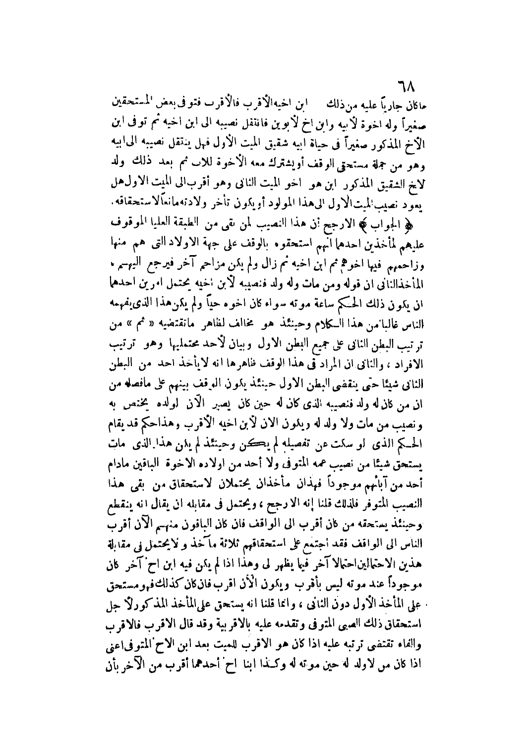 (الْجَوَابُ) الْأَرْجَحُ أَنَّ هَذَا النَّصِيبَ لِمَنْ بَقِيَ مِنْ الطَّبَقَةِ الْعُلْيَا الْمَوْقُوفِ عَلَيْهِمْ لِمَأْخَذَيْنِ أَحَدُهُمَا أَنَّهُمْ اسْتَحَقُّوهُ بِالْوَقْفِ عَلَى جِهَةِ الْأَوْلَادِ الَّتِي هُمْ مِنْهَا وَزَاحَمَهُمْ فِيهَا أَخُوهُمْ ثُمَّ ابْنُ أَخِيهِ ثُمَّ زَالَ وَلَمْ يَكُنْ مُزَاحِمٌ آخَرُ فَيَرْجِعُ إلَيْهِمْ، الْمَأْخَذُ الثَّانِي أَنَّ قَوْلَهُ وَمَنْ مَاتَ وَلَهُ وَلَدٌ فَنَصِيبُهُ لِابْنِ أَخِيهِ يَحْتَمِلُ أَمْرَيْنِ أَحَدُهُمَا أَنْ يَكُونَ ذَلِكَ الْحُكْمُ سَاعَةَ مَوْتِهِ سَوَاءٌ كَانَ أَخُوهُ حَيًّا وَلَمْ يَكُنْ هَذَا الَّذِي يَفْهَمُهُ النَّاسُ غَالِبًا مِنْ هَذَا الْكَلَامِ وَحِينَئِذٍ هُوَ مُخَالِفٌ لِظَاهِرِ مَا تَقْتَضِيهِ " ثُمَّ " مِنْ تَرْتِيبِ الْبَطْنِ الثَّانِي عَلَى جَمِيعِ الْبَطْنِ الْأَوَّلِ وَبَيَانٍ لِأَحَدِ مُحْتَمَلَيْهَا وَهُوَ تَرْتِيبُ الْأَفْرَادِ.