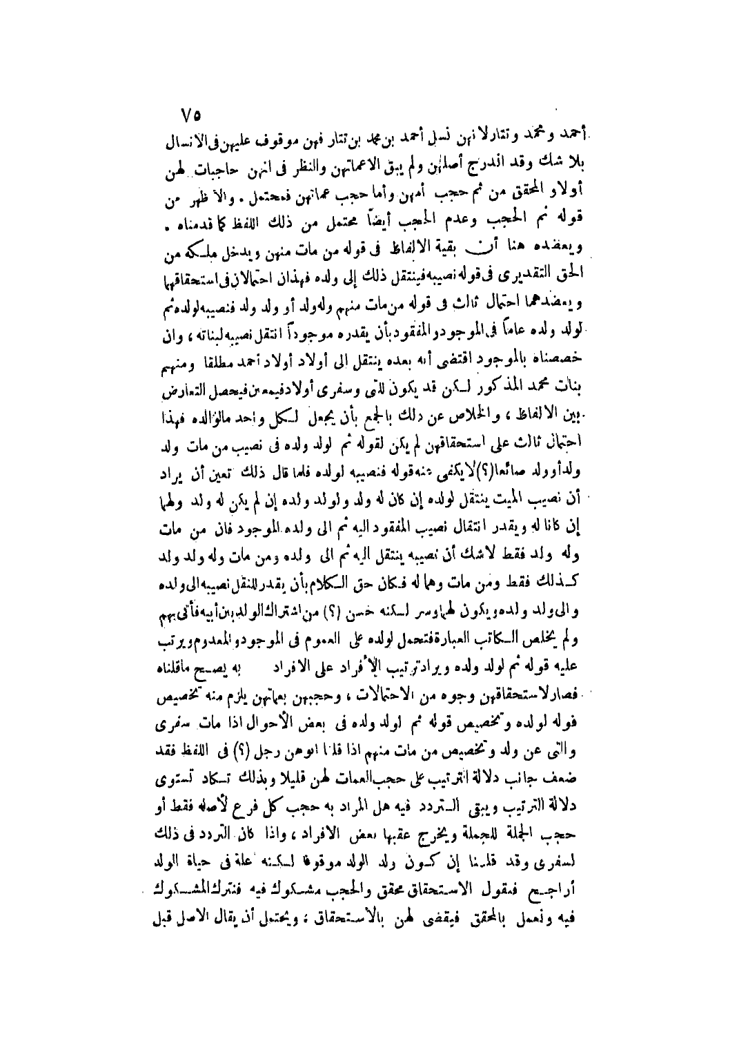 وَإِنْ خَصَصْنَاهُ بِالْمَوْجُودِ اقْتَضَى أَنَّهُ بَعْدَهُ يَنْتَقِلُ إلَى أَوْلَادِ أَوْلَادِ أَحْمَدَ مُطْلَقًا وَمِنْهُمْ بَنَاتُ مُحَمَّدٍ الْمَذْكُورِ لَكِنْ قَدْ يَكُونُ لِلَّتِي وَسَفْرَى أَوْلَادٌ فَيُمْنَعْنَ فَيَحْصُلُ التَّعَارُضُ بَيْنَ الْأَلْفَاظِ، وَالْخَلَاصُ عَنْ ذَلِكَ بِالْجَمْعِ بِأَنْ يُجْعَلَ لِكُلِّ وَاحِدٍ مَا لِوَالِدِهِ فَهَذَا احْتِمَالٌ ثَالِثٌ عَلَى اسْتِحْقَاقِهِنَّ لَمْ يَكُنْ لِقَوْلِهِ ثُمَّ لِوَلَدِ وَلَدِهِ فِي نَصِيبِ مَنْ مَاتَ وَلَهُ وَلَدٌ أَوْ وَلَدٌ ضَائِعًا (؟) لَا يَكْفِي عَنْهُ قَوْلُهُ فَنَصِيبُهُ لِوَلَدِهِ فَلَمَّا قَالَ ذَلِكَ تَعَيَّنَ أَنْ يُرَادَ أَنَّ نَصِيبَ الْمَيِّتِ يَنْتَقِلُ لِوَلَدِهِ إنْ كَانَ لَهُ وَلَدٌ وَلِوَلَدِ وَلَدِهِ إنْ لَمْ يَكُنْ لَهُ وَلَدٌ وَلَهُمَا إنْ كَانَا لَهُ وَيُقَدَّرُ انْتِقَالُ نَصِيبِ الْمَفْقُودِ إلَيْهِ ثُمَّ إلَى وَلَدِهِ الْمَوْجُودِ فَإِنَّ مَنْ مَاتَ وَلَهُ وَلَدٌ فَقَطْ لَا شَكَّ أَنْ نَصِيبَهُ يَنْتَقِلُ إلَيْهِ ثُمَّ إلَى وَلَدِهِ وَمَنْ مَاتَ وَلَهُ وَلَدُ وَلَدٍ كَذَلِكَ فَقَطْ وَمَنْ مَاتَ وَهُمَا لَهُ فَكَانَ حَقُّ الْكَلَامِ بِأَنْ يُقَدِّرَ لِلنَّقْلِ نَصِيبَهُ إلَى وَلَدِهِ وَإِلَى وَلَدِ وَلَدِهِ وَيَكُونُ لَهُمَا سِرٌّ لَكِنَّهُ حَسَنٌ (؟) مِنْ اشْتِرَاكِ الْوَلَدِ بَيْنَ أَبِيهِ فَأَتَى بِهِمْ وَلَمْ يُخْلِصْ الْكَاتِبُ الْعِبَارَةَ فَتُحْمَلُ لِوَلَدِهِ عَلَى الْعُمُومِ فِي الْمَوْجُودِ وَالْمَعْدُومِ وَيُرَتَّبُ عَلَيْهِ قَوْلُهُ ثُمَّ لِوَلَدِ وَلَدِهِ وَيُرَادُ تَرْتِيبُ الْأَفْرَادِ عَلَى الْأَفْرَادِ بِهِ يَصِحُّ مَا قُلْنَاهُ فَصَارَ لِاسْتِحْقَاقِهِنَّ وُجُوهٌ مِنْ الِاحْتِمَالَاتِ.