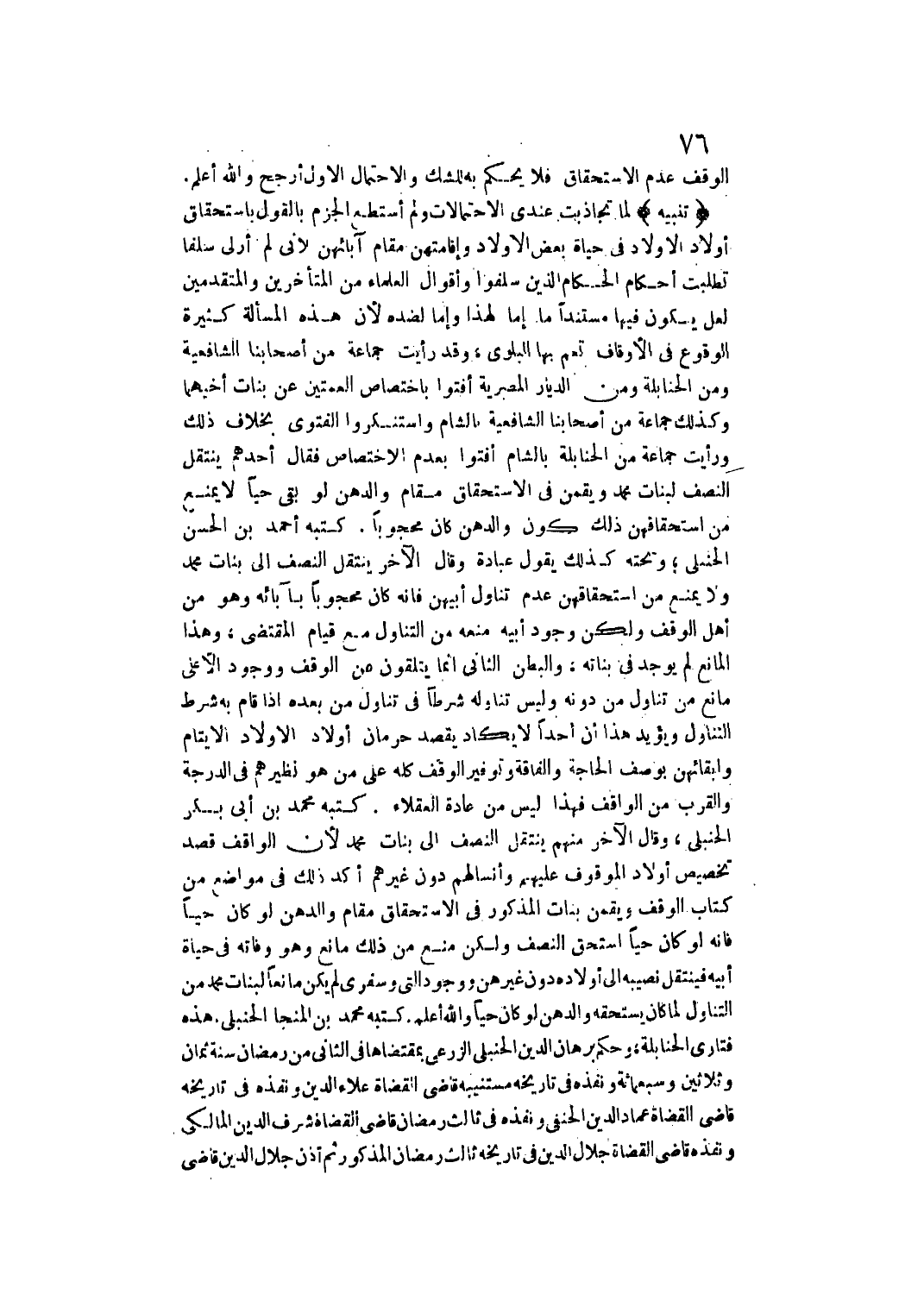 (تَنْبِيهٌ) لَمَّا تَجَاذَبَتْ عِنْدِي الِاحْتِمَالَاتُ وَلَمْ أَسْتَطِعْ الْجَزْمَ بِالْقَوْلِ بِاسْتِحْقَاقِ أَوْلَادِ الْأَوْلَادِ فِي حَيَاةِ بَعْضِ الْأَوْلَادِ وَإِقَامَتِهِنَّ مَقَامَ آبَائِهِنَّ؛ لِأَنِّي لَمْ أَرَ لِي سَلَفًا تَطَلَّبْتُ أَحْكَامَ الْحُكَّامِ الَّذِينَ سَلَفُوا وَأَقْوَالَ الْعُلَمَاءِ مِنْ الْمُتَأَخِّرِينَ وَالْمُتَقَدِّمِينَ لَعَلَّ يَكُونُ فِيهَا مُسْتَنَدًا مَا إمَّا لِهَذَا وَإِمَّا لِضِدِّهِ؛ لِأَنَّ هَذِهِ الْمَسْأَلَةَ كَثِيرَةُ الْوُقُوعِ فِي الْأَوْقَافِ تَعُمُّ بِهَا الْبَلْوَى، وَقَدْ رَأَيْت جَمَاعَةً مِنْ أَصْحَابِنَا الشَّافِعِيَّةِ وَمِنْ الْحَنَابِلَةِ وَمِنْ الدِّيَارِ الْمِصْرِيَّةِ أَفْتَوْا بِاخْتِصَاصِ الْعَمَّتَيْنِ عَنْ بَنَاتِ أَخِيهِمَا وَكَذَلِكَ جَمَاعَةٌ مِنْ أَصْحَابِنَا الشَّافِعِيَّةِ بِالشَّامِ وَاسْتَنْكَرُوا الْفَتْوَى بِخِلَافِ ذَلِكَ وَرَأَيْت جَمَاعَةً مِنْ الْحَنَابِلَةِ بِالشَّامِ أَفْتَوْا بِعَدَمِ الِاخْتِصَاصِ فَقَالَ أَحَدُهُمْ يَنْتَقِلُ النِّصْفُ لِبَنَاتِ مُحَمَّدٍ وَيَقُمْنَ فِي الِاسْتِحْقَاقِ مَقَامَ وَالِدِهِنَّ لَوْ بَقِيَ حَيًّا لَا يَمْنَعُ مِنْ اسْتِحْقَاقِهِنَّ ذَلِكَ كَوْنُ وَالِدِهِنَّ كَانَ مَحْجُوبًا.