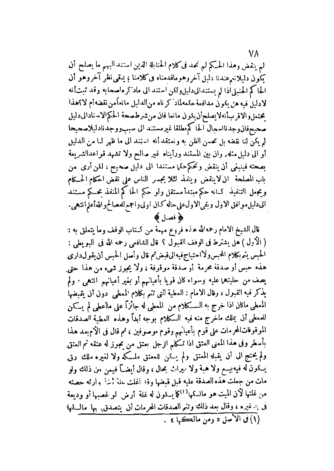 (فَصْلٌ) قَالَ الشَّيْخُ الْإِمَامُ - رَحِمَهُ اللَّهُ -: هَذِهِ فُرُوعٌ مُهِمَّةٌ مِنْ كِتَابِ الْوَقْفِ، وَمَا يَتَعَلَّقُ بِهِ: (الْأَوَّلُ) هَلْ يُشْتَرَطُ فِي الْوَقْفِ الْقَبُولُ؟ قَالَ الشَّافِعِيُّ: - رَحِمَهُ اللَّهُ - فِي الْبُوَيْطِيِّ: الْحَبْسُ يَتِمُّ بِكَلَامِ الْمُحْبِسِ، وَلَا احْتِيَاجَ فِيهِ إلَى قَبْضٍ ثُمَّ قَالَ: وَأَصْلُ الْحَبْسِ أَنْ يَقُولَ: دَارِي هَذِهِ حَبْسٌ، أَوْ صَدَقَةٌ مُحَرَّمَةٌ، أَوْ صَدَقَةٌ مَوْقُوفَةٌ، وَلَا يَجُوزُ شَيْءٌ مِنْ هَذَا حَتَّى يَصِفَ مِنْ حِلْيَتِهِمَا عَلَيْهِ، وَسَوَاءٌ كَانَ قَوِيًّا بِأَعْيَانِهِمْ، أَوْ بِغَيْرِ أَعْيَانِهِمْ انْتَهَى.