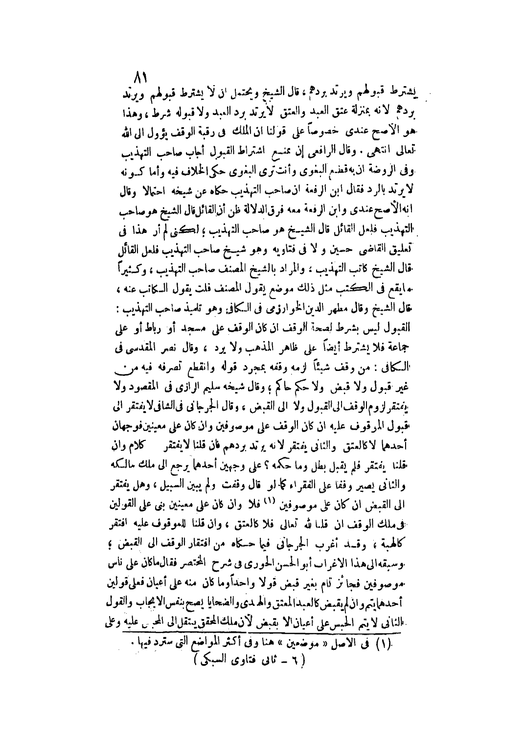 مَوْضِعٌ يَقُولُ الْمُصَنِّفُ قُلْت: يَقُولُ الْكَاتِبُ عَنْهُ: قَالَ الشَّيْخُ وَقَالَ مَظْهَرُ الدِّينِ الْخُوَارِزْمِيُّ فِي الْكَافِي، وَهُوَ تِلْمِيذُ صَاحِبِ التَّهْذِيبِ: الْقَبُولُ لَيْسَ بِشَرْطٍ لِصِحَّةِ الْوَقْفِ إنْ كَانَ الْوَقْفُ عَلَى مَسْجِدٍ، أَوْ رِبَاطٍ، أَوْ عَلَى جَمَاعَةٍ فَلَا يُشْتَرَطُ أَيْضًا عَلَى ظَاهِرِ الْمَذْهَبِ، وَلَا يُرَدُّ.