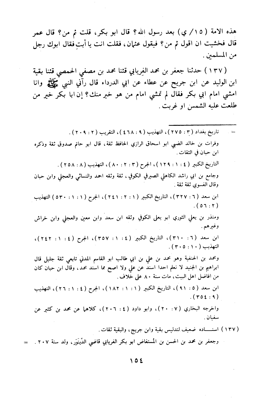 137 - حَدَّثَنَا جَعْفَرُ بْنُ مُحَمَّدٍ الْفِرْيَابِيُّ قثنا مُحَمَّدُ بْنُ مُصَفَّى الْحِمْصِيُّ قثنا بَقِيَّةُ بْنُ الْوَلِيدِ، عَنِ ابْنِ جُرَيْجٍ، عَنْ عَطَاءٍ، عَنْ أَبِي الدَّرْدَاءِ قَالَ: رَآنِي النَّبِيُّ صَلَّى اللهُ عَلَيْهِ وَسَلَّمَ وَأَنَا أَمْشِي أَمَامَ أَبِي بَكْرٍ فَقَالَ: «§لِمَ تَمْشِي أَمَامَ مَنْ هُوَ خَيْرٌ مِنْكَ؟ إِنَّ أَبَا بَكْرٍ خَيْرُ مَنْ طَلَعَتْ عَلَيْهِ الشَّمْسُ، أَوْ غَرَبَتْ» .