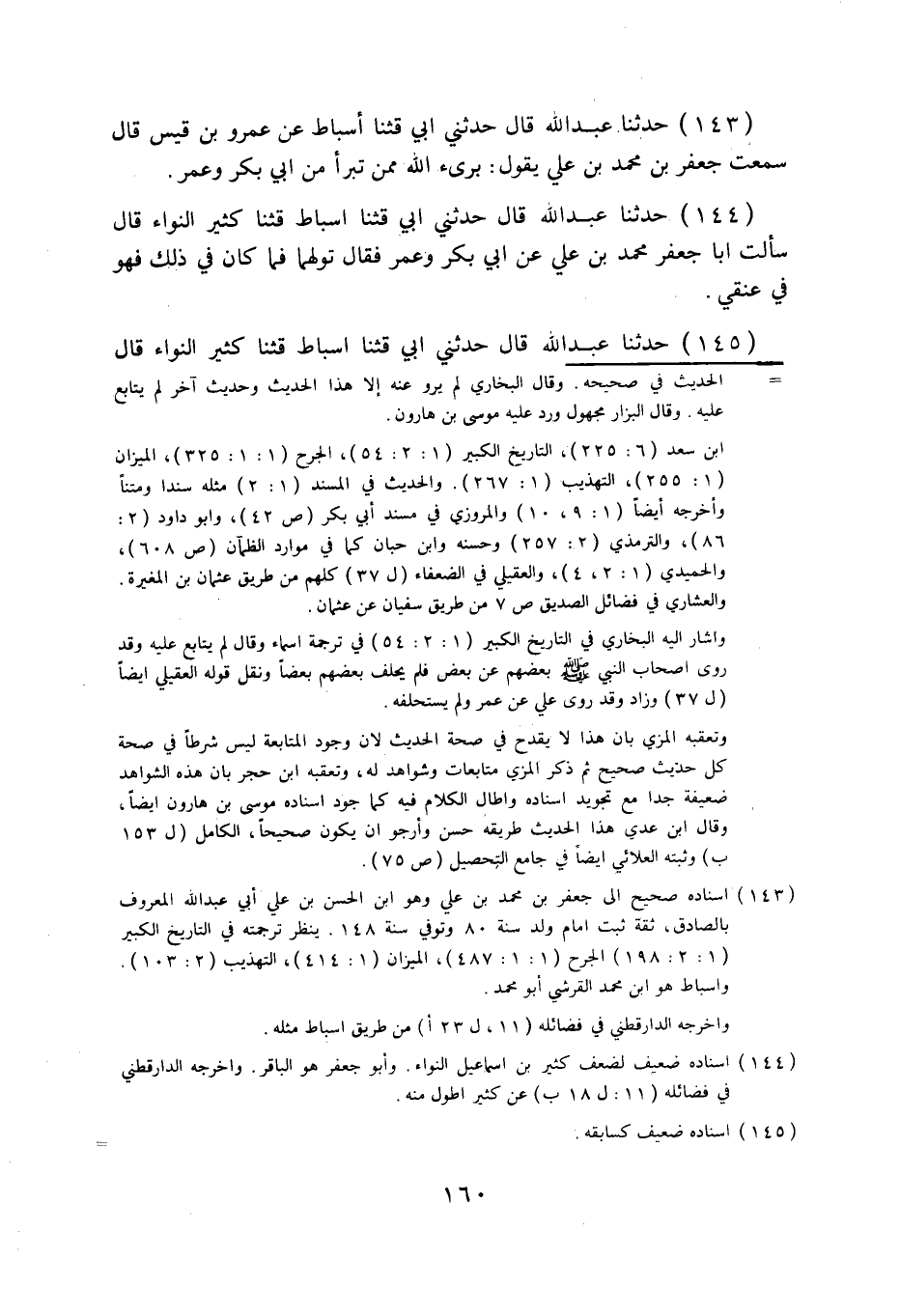 143 - حَدَّثَنَا عَبْدُ اللَّهِ قَالَ: حَدَّثَنِي أَبِي، قثنا أَسْبَاطٌ، عَنْ عَمْرِو بْنِ قَيْسٍ قَالَ: سَمِعْتُ جَعْفَرَ بْنَ مُحَمَّدِ بْنِ عَلِيٍّ يَقُولُ: §بَرِئَ اللَّهُ مِمَّنْ تَبَرَّأَ مِنْ أَبِي بَكْرٍ وَعُمَرَ.