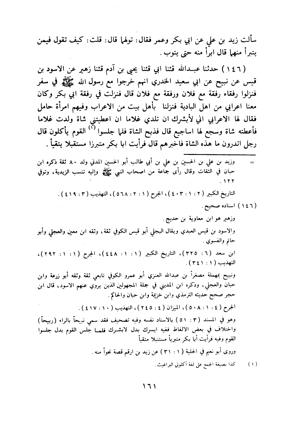 146 - حَدَّثَنَا عَبْدُ اللَّهِ، قثنا أَبِي، قثنا يَحْيَى بْنُ آدَمَ قثنا زُهَيْرٌ، عَنِ الْأَسْوَدِ بْنِ قَيْسٍ، عَنْ نُبَيْحٍ، عَنْ أَبِي سَعِيدٍ الْخُدْرِيِّ، أَنَّهُمْ خَرَجُوا مَعَ رَسُولِ اللَّهِ صَلَّى اللهُ عَلَيْهِ وَسَلَّمَ فِي سَفَرٍ، فَنَزَلُوا رُفَقَاءَ، رُفْقَةٌ مَعَ فُلَانٍ، وَرُفْقَةٌ مَعَ فُلَانٍ، قَالَ: فَنَزَلْتُ فِي رُفْقَةِ أَبِي بَكْرٍ، وَكَانَ مَعَنَا أَعْرَابِيٌّ مِنْ أَهْلِ الْبَادِيَةِ، فَنَزَلْنَا بِأَهْلِ بَيْتٍ مِنَ الْأَعْرَابِ وَفِيهِمُ امْرَأَةٌ حَامِلٌ، فَقَالَ لَهَا الْأَعْرَابِيُّ: إِنِّي لَأُبَشِّرُكِ أَنْ تَلِدِي غُلَامًا إِنْ أَعْطَيْتِنِي شَاةً، وَلَدَتْ غُلَامًا فَأَعْطَتْهُ شَاةً، وَسَجَعَ لَهَا أَسَاجِيعَ، قَالَ: فَذَبَحَ الشَّاةَ، فَلَمَّا جَلَسُوا الْقَوْمُ يَأْكُلُونَ قَالَ رَجُلٌ: §أَتَدْرُونَ مَا هَذِهِ الشَّاةُ؟ فَأَخْبَرَهُمْ، قَالَ: فَرَأَيْتُ أَبَا بَكْرٍ مُتَبَرِّزًا مُسْتَقْبِلًا يَتَقَيَّأُ.