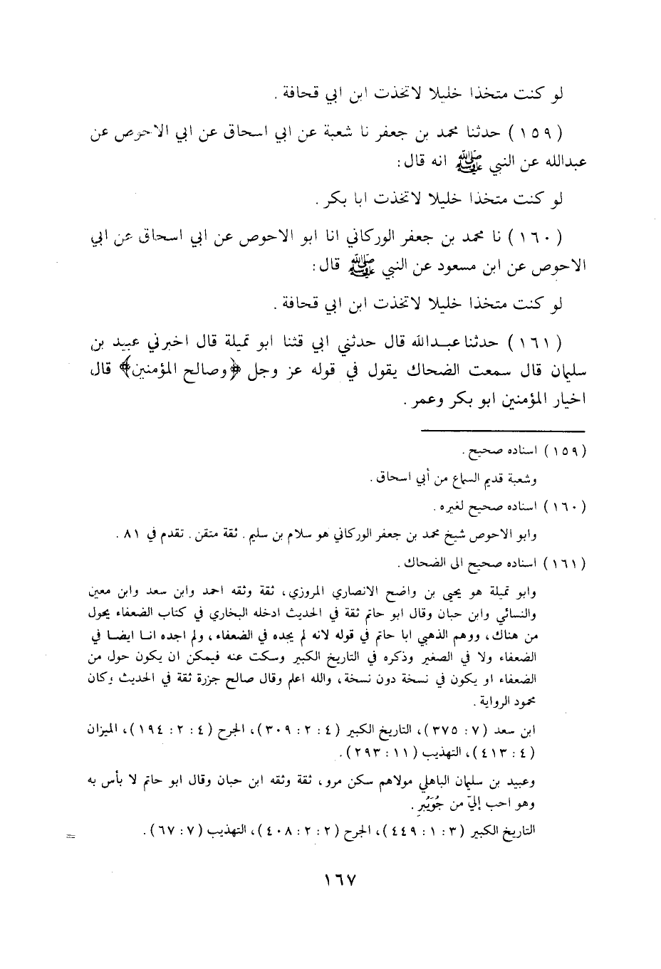 160 - نا مُحَمَّدُ بْنُ جَعْفَرٍ الْوَرْكَانِيُّ، أنا أَبُو الْأَحْوَصِ، عَنْ أَبِي إِسْحَاقَ، عَنْ أَبِي الْأَحْوَصِ، عَنِ ابْنِ مَسْعُودٍ، عَنِ النَّبِيِّ صَلَّى اللهُ عَلَيْهِ وَسَلَّمَ قَالَ: «§لَوْ كُنْتُ مُتَّخِذًا خَلِيلًا لَاتَّخَذْتُ ابْنَ أَبِي قُحَافَةَ» .