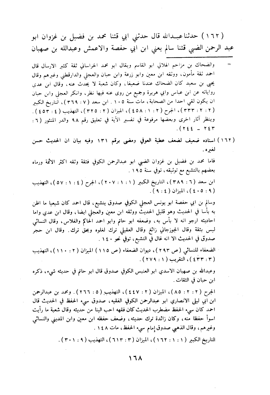 162 - حَدَّثَنَا عَبْدُ اللَّهِ قَالَ: حَدَّثَنِي أَبِي، قثنا مُحَمَّدُ بْنُ فُضَيْلِ بْنِ غَزْوَانَ أَبُو عَبْدِ الرَّحْمَنِ الضَّبِّيُّ قثنا سَالِمٌ، يَعْنِي ابْنَ أَبِي حَفْصَةَ، وَالْأَعْمَشُ، وَعَبْدُ اللَّهِ بْنُ صُهْبَانَ، وَكَثِيرٌ النَّوَّاءُ، وَابْنُ أَبِي لَيْلَى، عَنْ عَطِيَّةَ الْعَوْفِيِّ، عَنْ أَبِي سَعِيدٍ الْخُدْرِيِّ قَالَ: قَالَ رَسُولُ اللَّهِ صَلَّى اللهُ عَلَيْهِ وَسَلَّمَ: «§إِنَّ أَهْلَ الدَّرَجَاتِ الْعُلَى لَيَرَاهُمْ مَنْ تَحْتَهُمْ كَمَا تَرَوْنَ النَّجْمَ الطَّالِعَ فِي أُفُقٍ مِنْ آفَاقِ السَّمَاءِ، وَإِنَّ أَبَا بَكْرٍ وَعُمَرَ مِنْهُمْ، وَأَنْعَمَا» .