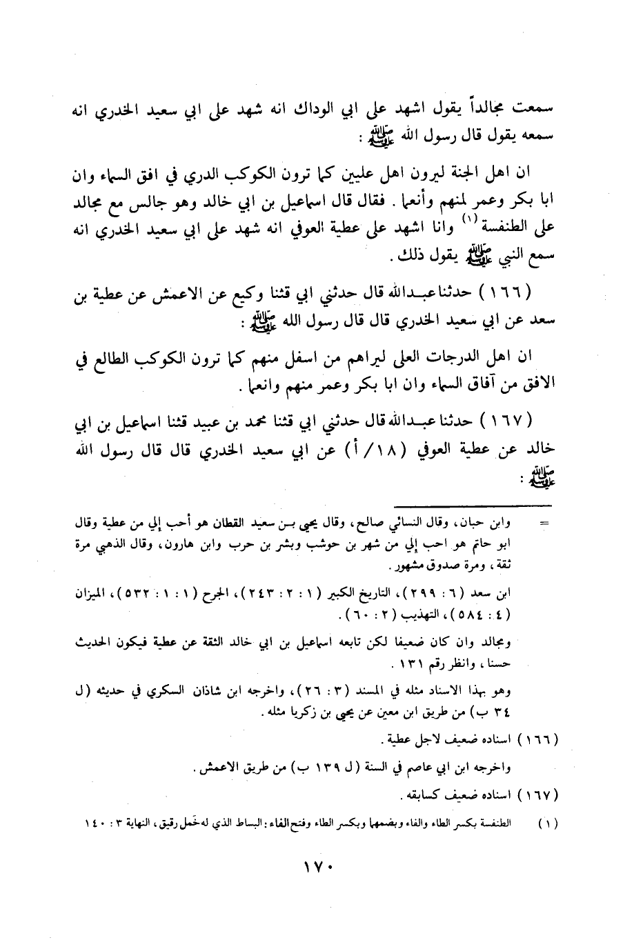 166 - حَدَّثَنَا عَبْدُ اللَّهِ قَالَ: حَدَّثَنِي أَبِي، قثنا وَكِيعٌ، عَنِ الْأَعْمَشِ، عَنْ عَطِيَّةَ بْنِ سَعْدٍ، عَنْ أَبِي سَعِيدٍ الْخُدْرِيِّ قَالَ: قَالَ رَسُولُ اللَّهِ صَلَّى اللهُ عَلَيْهِ وَسَلَّمَ: «إِنَّ §أَهْلَ الدَّرَجَاتِ الْعُلَى لَيَرَاهُمْ مَنْ أَسْفَلَ مِنْهُمْ، كَمَا تَرَوْنَ الْكَوْكَبَ الطَّالِعَ فِي الْأُفُقِ مِنْ آفَاقِ السَّمَاءِ، وَإِنَّ أَبَا بَكْرٍ وَعُمَرَ مِنْهُمْ، وَأَنْعَمَا» .